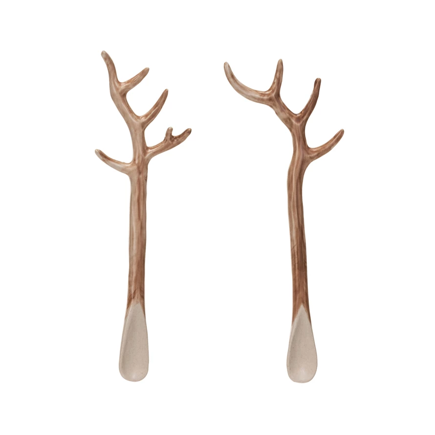 Catalog Name: 5-3/4"L x 2-1/4"W Stoneware Spoon w/ Antler Handle, Reactive Glaze, 2 Styles (Each One Will Vary)