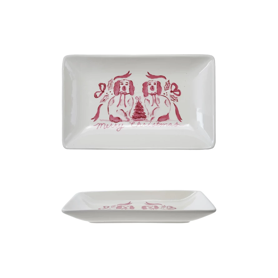 Catalog Name: 8-1/4"L x 5"W Stoneware Dish w/ Staffordshire Dogs Image "Merry Christmas", Pink, Red & White ©