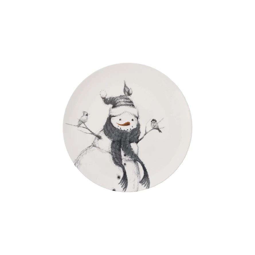 Catalog Name: 12" Round Stoneware Serving Platter w/ Snowman & Birds Image, Black, White & Orange Color ©