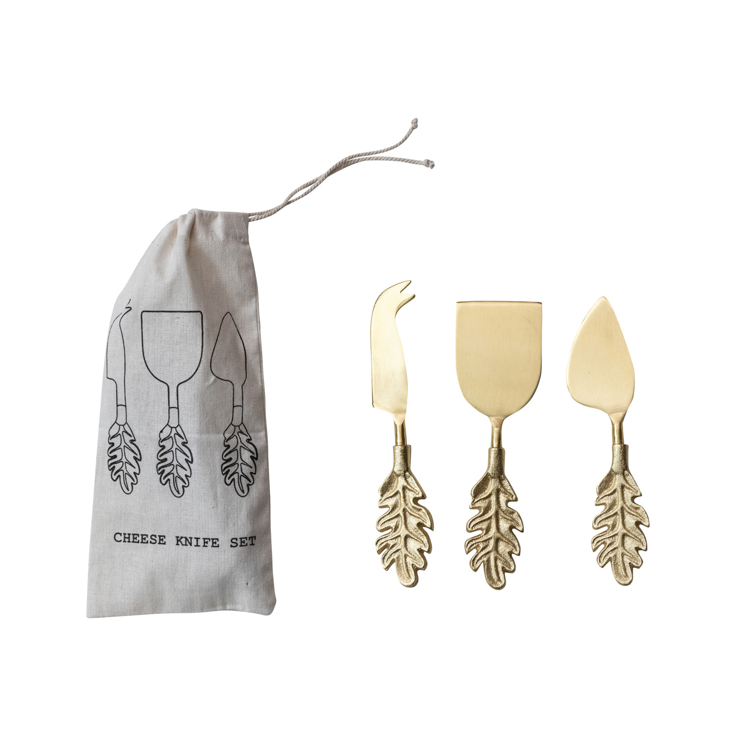 Catalog Name: 6-1/2"L - 6-3/4"L Stainless Steel & Cast Aluminum Cheese Knives w/ Leaf Shaped Handles, Gold Finish, Set of 3 in Printed Drawstring Bag