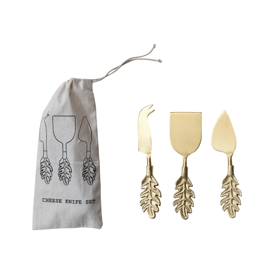 Cheese Knives with Leaf Shaped Handles, Set of 3 in Drawstring Bag