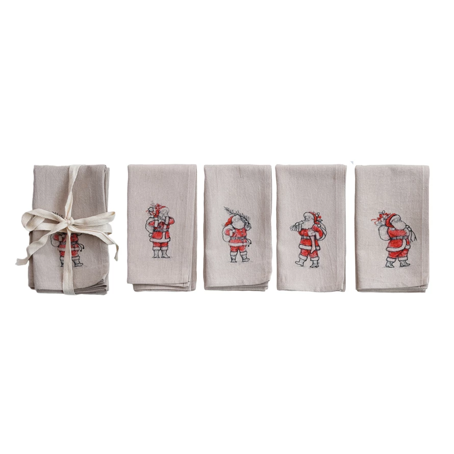 Napkins with Embroidered Santa Image, Natural, Set of 4 Tied with Tape ©
