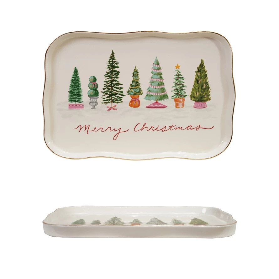 Catalog Name: 13"L x 8-3/4"W Stoneware Scalloped Platter w/ Trees & Gold Electroplating "Merry Christmas", Multi Color ©