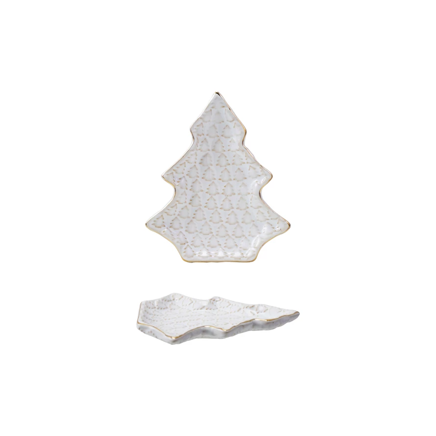 Catalog Name: 6"L x 5"W Stoneware Tree Shaped Plate w/ Trees & Gold Electroplating, Reactive Glaze, White (Each One Will Vary)