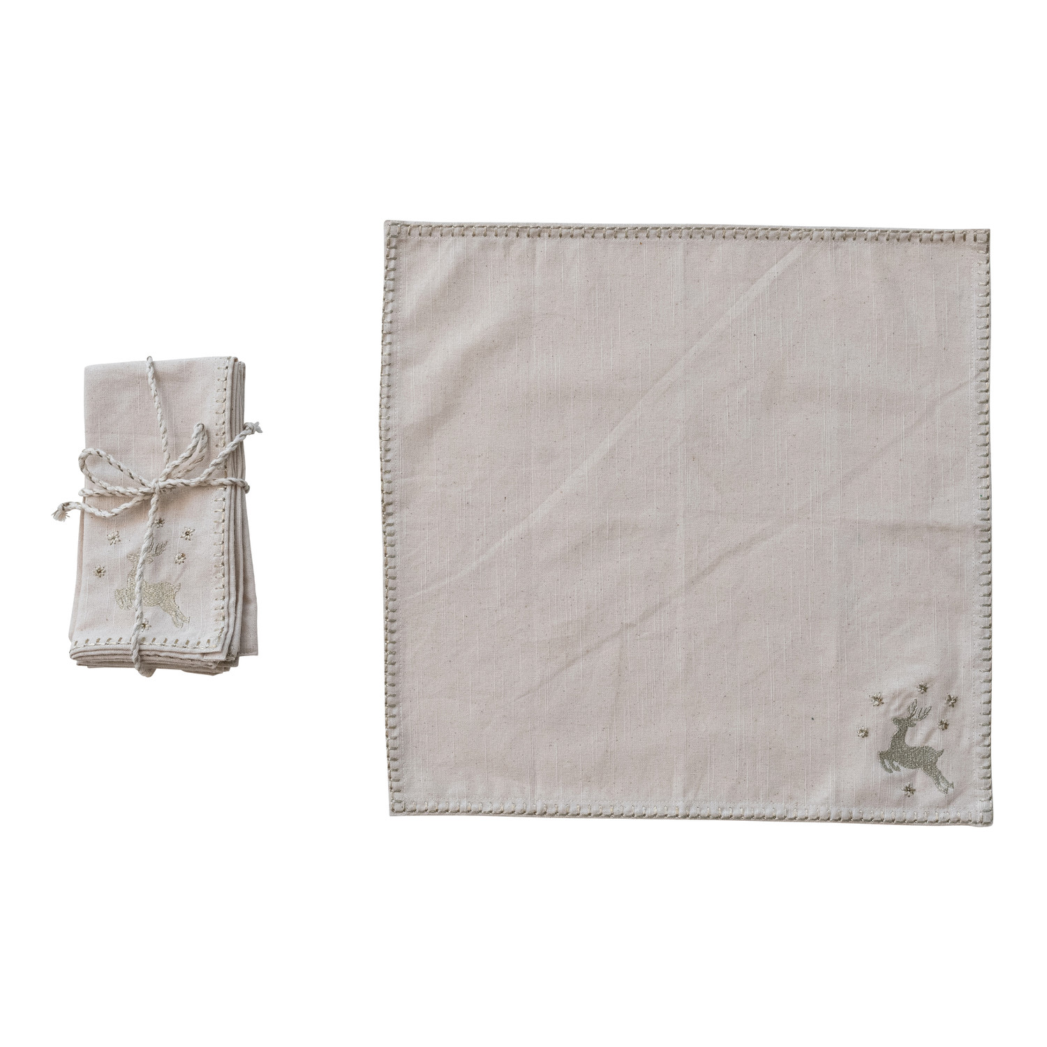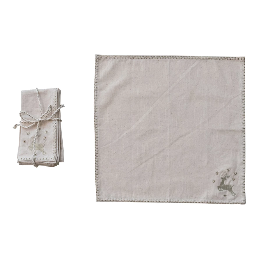 Catalog Name: 18" Square Cotton Napkins w/ Metallic Thread Embroidered Deer & Blanket Stitch Trim, Natural & Silver Color, Set of 4 Tied w/ Metallic Cotton Rope