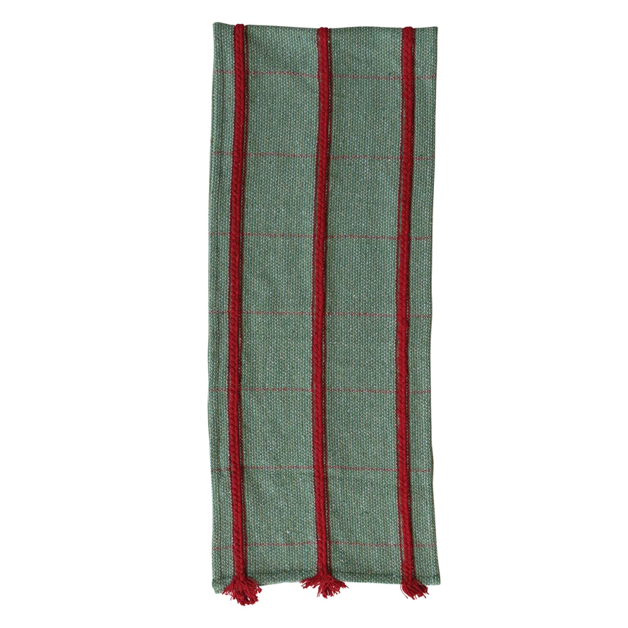 Catalog Name: 72"L x 14"W Woven Recycled Blend Table Runner w/ Braided Embroidery, Grid Pattern & Fringe, Green & Red