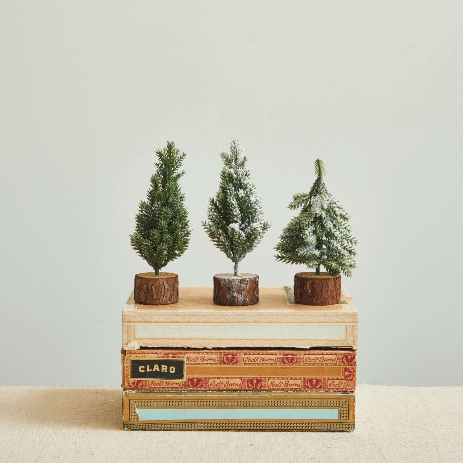 Catalog Name: 3" Round x 5-3/4"H & 2-1/4" Round x 6-1/2"H Faux Fir Tree w/ Wood Base, Snow Finish, Green, 3 Styles