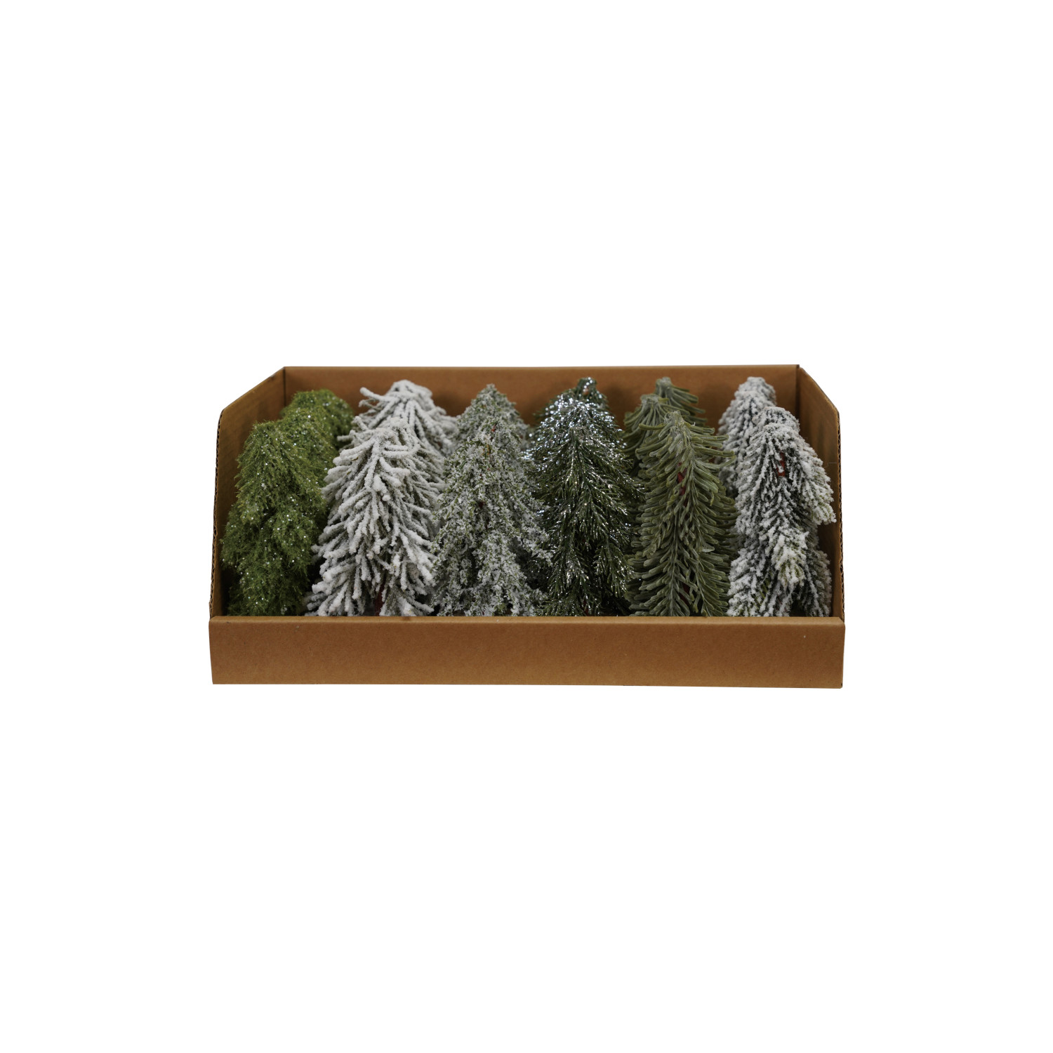 Catalog Name: 2" Round x 4-1/2"H Faux Evergreen Trees w/ Natural Wood Slice Bases, Snow/Ice Finish, Boxed Set of 24