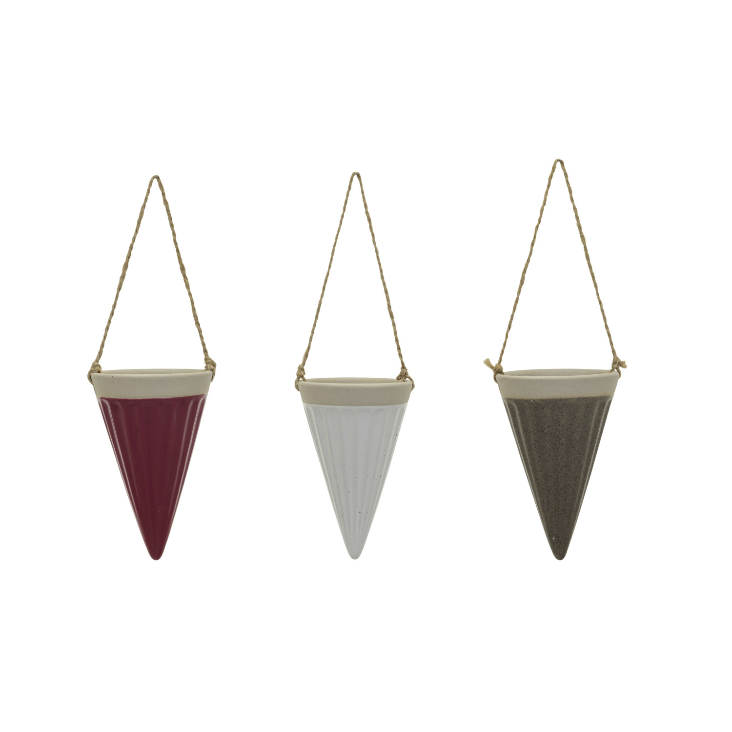 Debossed Stoneware Hanging Cone Vase w/ Jute Rope Hanger, 3 Colors