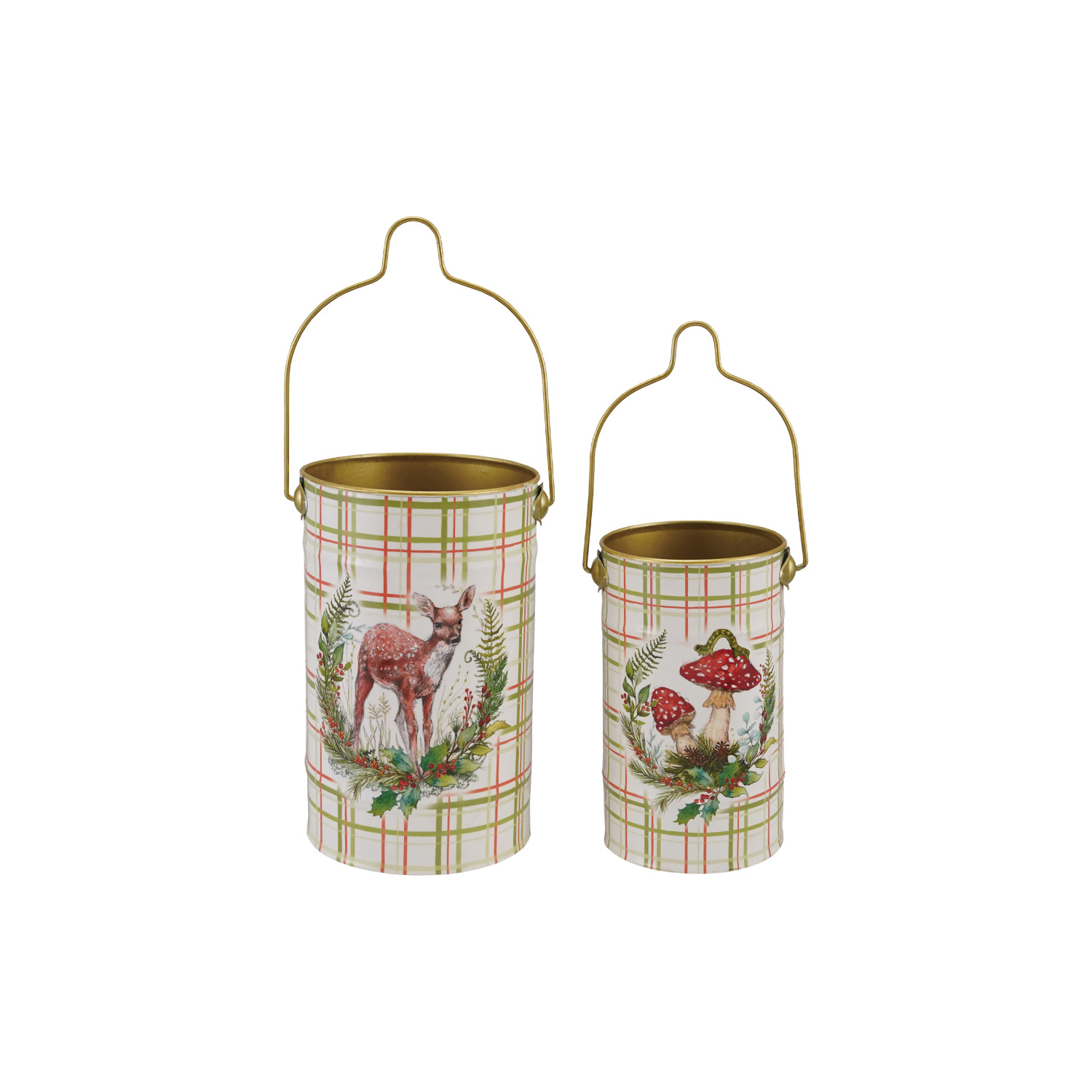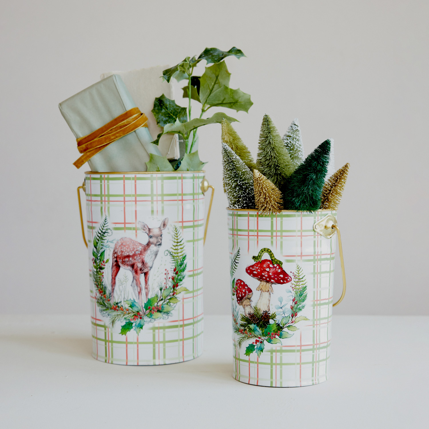 Metal Buckets with Woodland Animals, Seasonal Botanicals & Plaid Pattern, Set of 2 ©