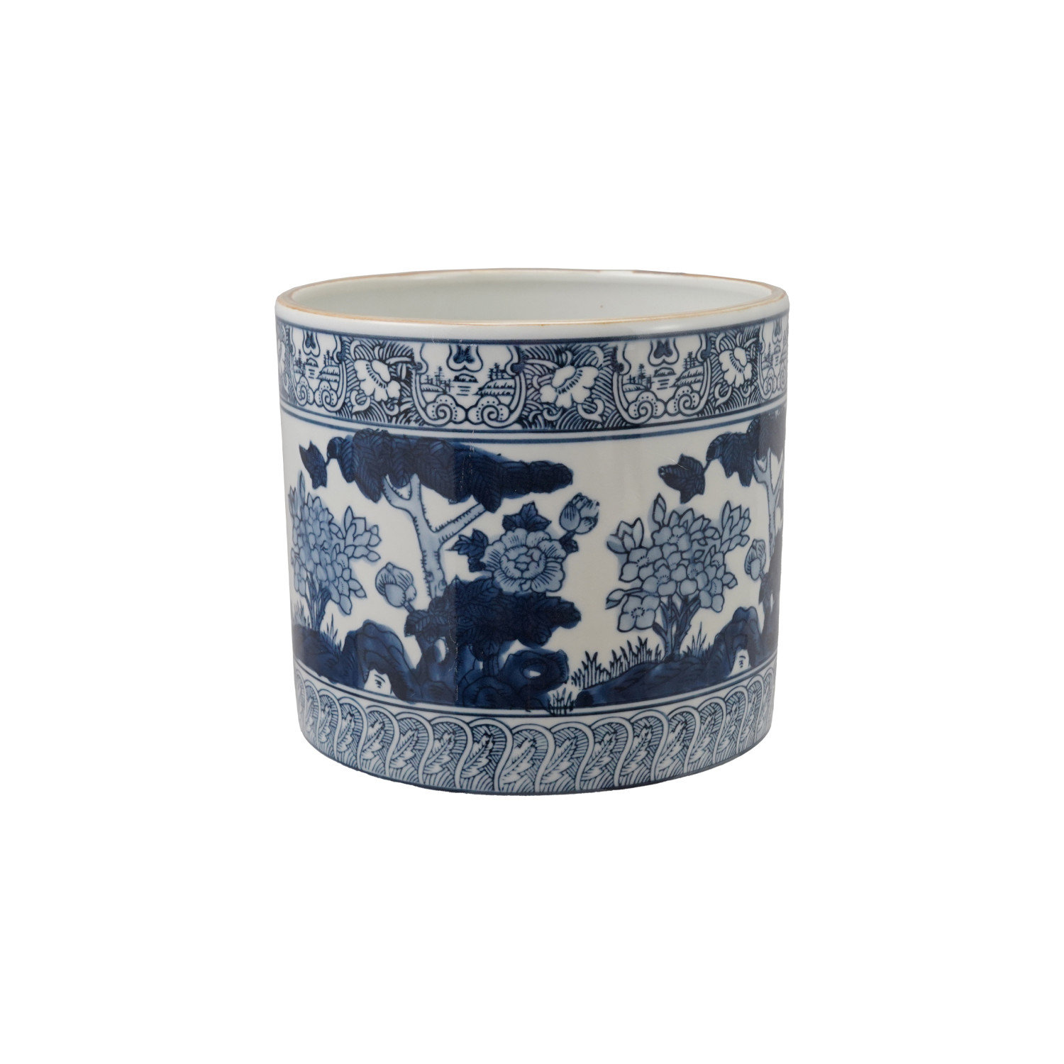 Catalog Name: 8" Round x 7-1/4"H Stoneware Planter w/ Patterned Borders & Botanicals, White & Blue (Holds 7" Pot)
