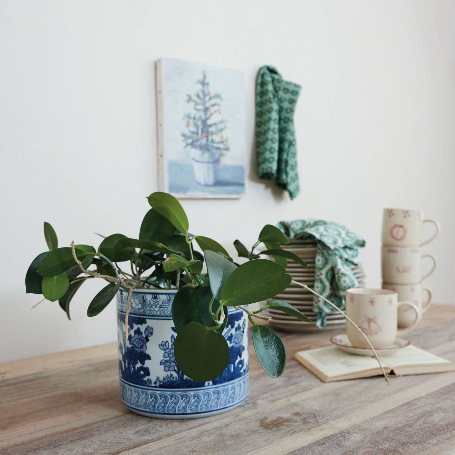 Stoneware Planter with Patterned Borders & Botanicals, White & Blue (Holds 7" Pot)