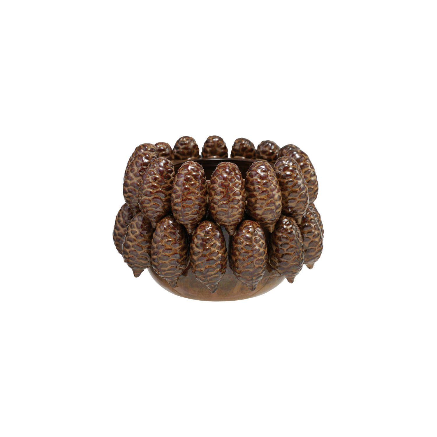 Catalog Name: 8-1/2" Round x 6"H Stoneware Planter w/ 3D Pinecones, Reactive Glaze, Brown (Holds 4" Pot) (Each One Will Vary)
