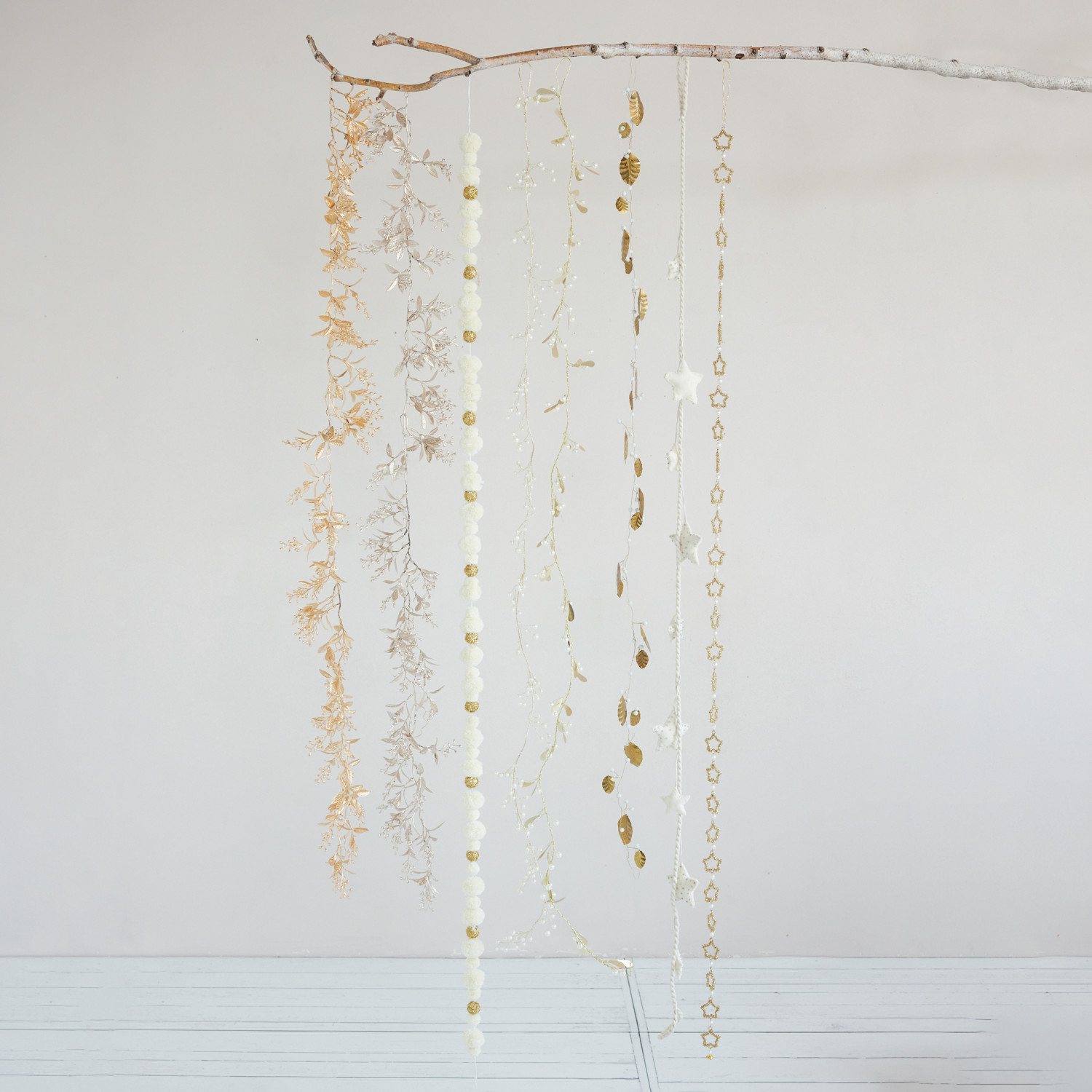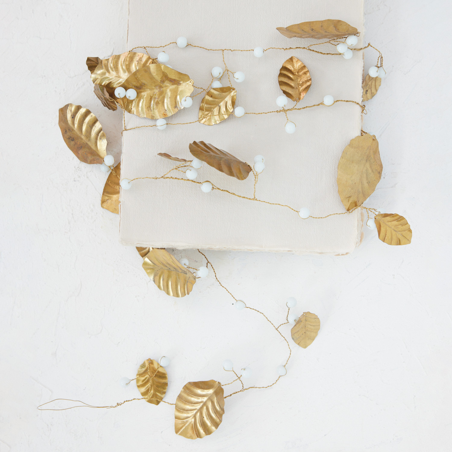 Brass Leaf & Acrylic Bead Garland, Gold Finish & White