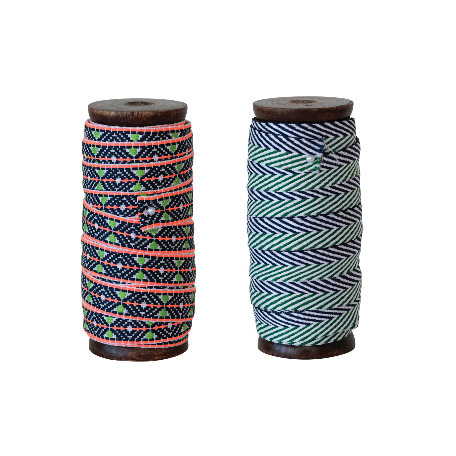 This set of two jacquard fabric ribbons features a wood spool pattern with multicolor and a round shape. Made of polyester, these ribbons are durable and versatile, making them suitable for various craft projects. Each ribbon has a different pattern, such as blue, white, and green zig zags or multi-colored geometric diamonds. They are stylish and versatile, suitable for wrapping gifts, making bows, decorating cards, or embellishing home accessories. The ribbons measure 360 inches in length and suit any occasion or theme. It is a versatile addition to any craft project, adding depth and variety to the collection.