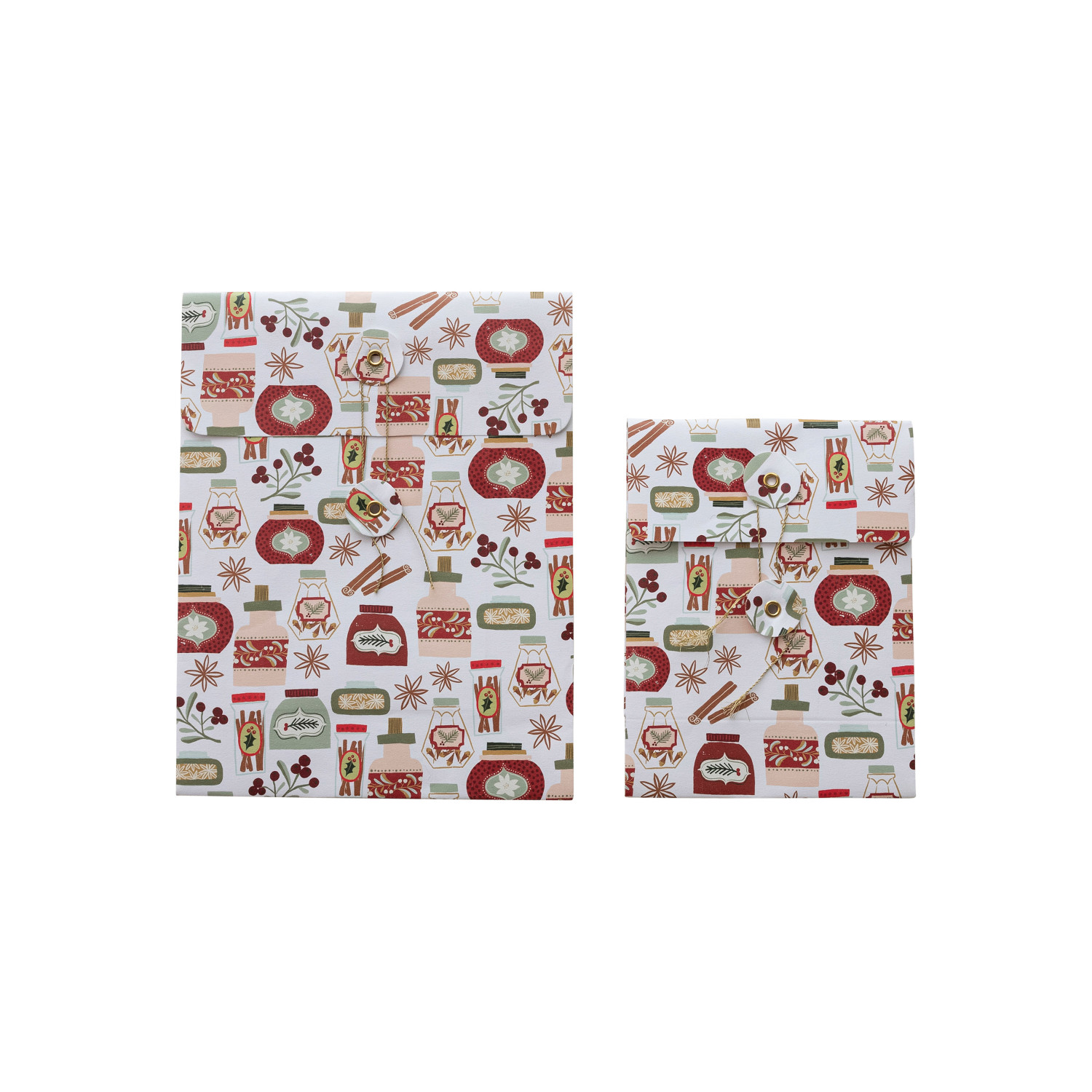 This set of 2 printed paper gift bags is the perfect wrapping solution for the holiday season. The multi-colored patterns adorned with brass accents give these bags a touch of sophistication, while the brass handles ensure durability and easy carrying. The larger bag measures 9 inches in length, 4 inches in width, and 11.5 inches in height, and the smaller one is 6.5 inches long, 3.5 inches wide, and 8.5 inches high, making them ideal for gifts of different sizes. Whether it's for a secret Santa, a thoughtful gift for a loved one, or a token of appreciation for a colleague, these bags will make every present stand out under the Christmas tree. A duo of paper gift bags, each boasting a vibrant holiday pattern and brass detailing, ready to spread festive cheer. An excellent choice for seasonal gifting, these bags elevate presents with their joyful designs and elegant brass handles. Ideal for wrapping holiday gifts, these bags are versatile for Christmas exchanges, office parties, or family gatherings.