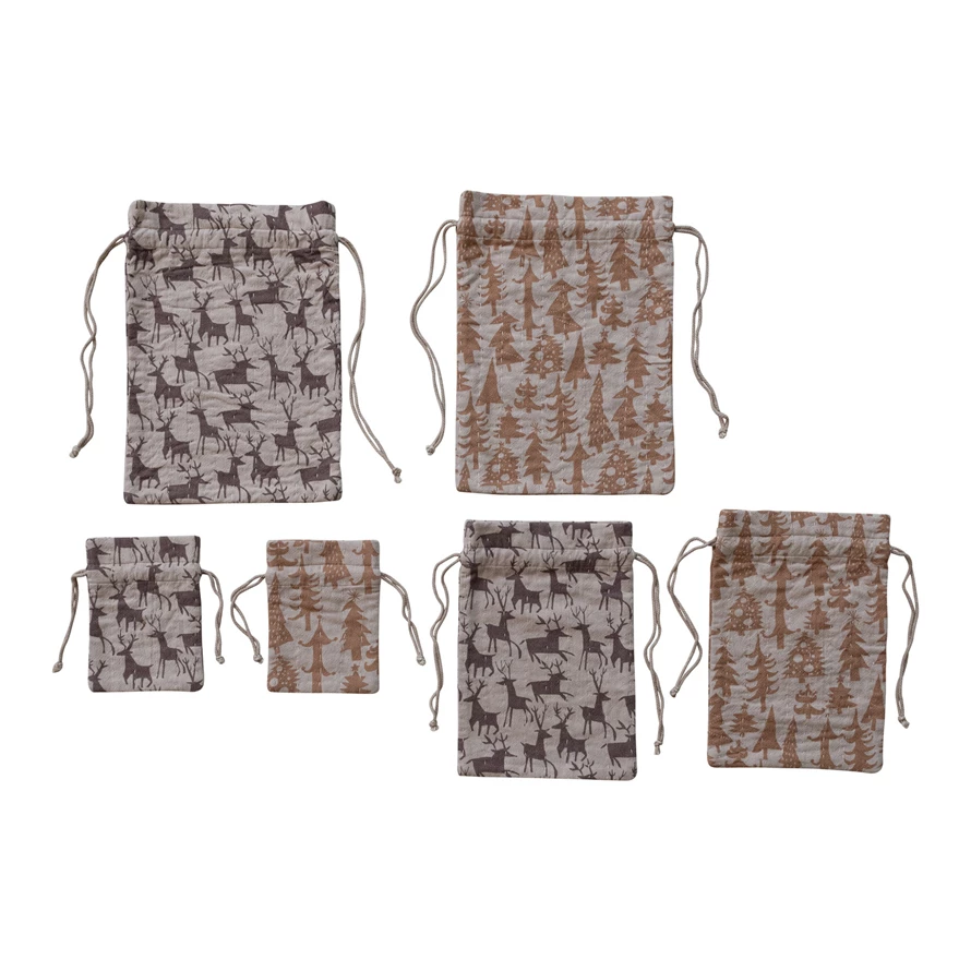 Catalog Name: 14"L x 10"W, 12"L x 8"W & 7"L x 5"W Stonewashed Voile Printed Drawstring Bags w/ Holiday Pattern & Hand-Embroidered Kantha Stitch, Set of 3, 2 Styles ©