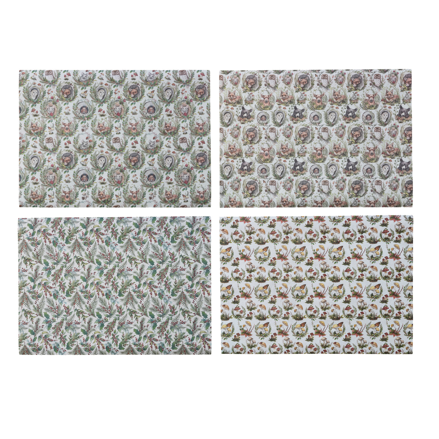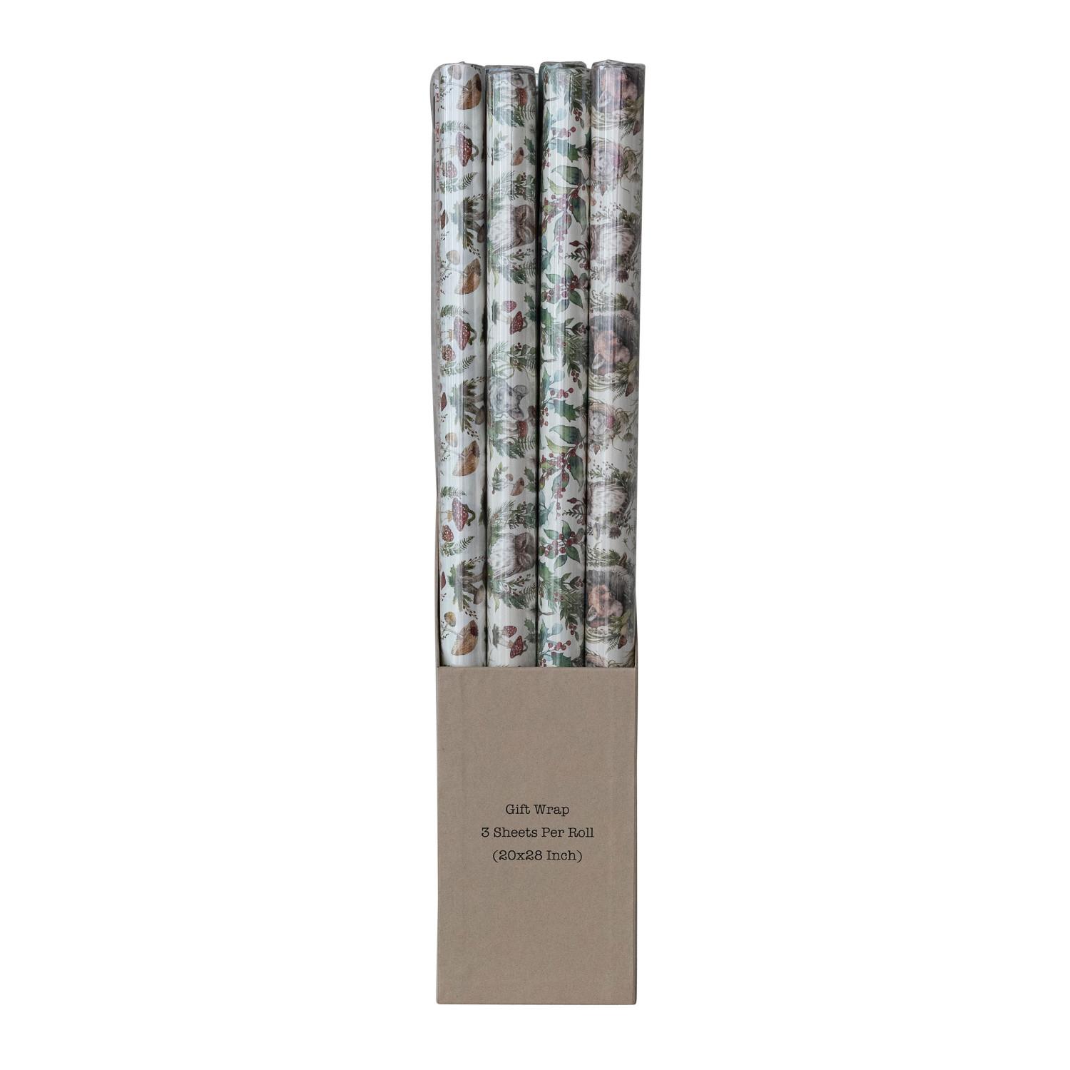 Catalog Name: 28"L x 20"W Handmade Printed Recycled Wrapping Paper Sheets w/ Woodland Animals & Seasonal Botanicals Patterns, Multi Color, 4 Styles, Set of 12 Rolls in Kraft Display Box (3 Sheets Per Roll, 3 Rolls Per Style) ©