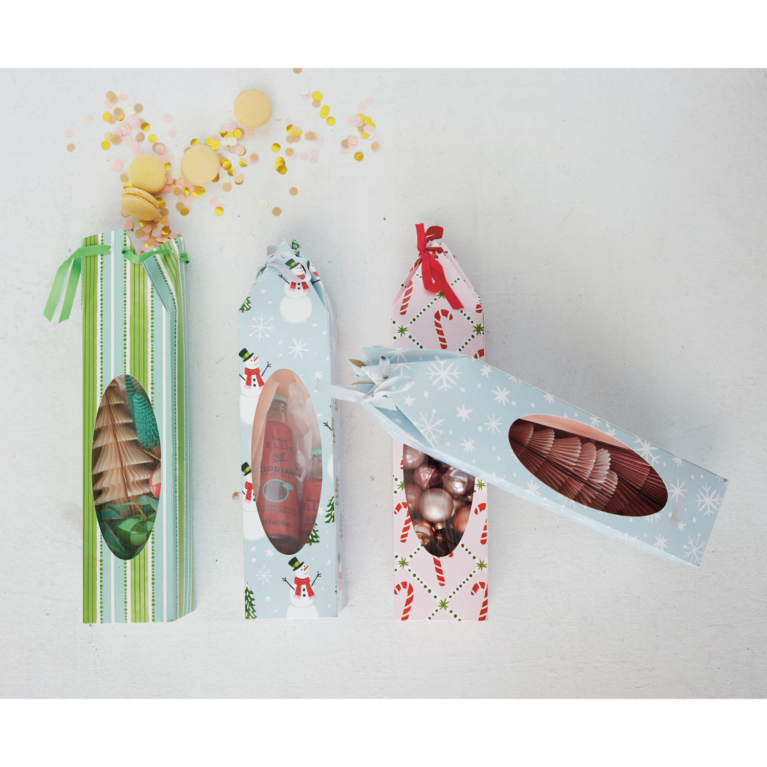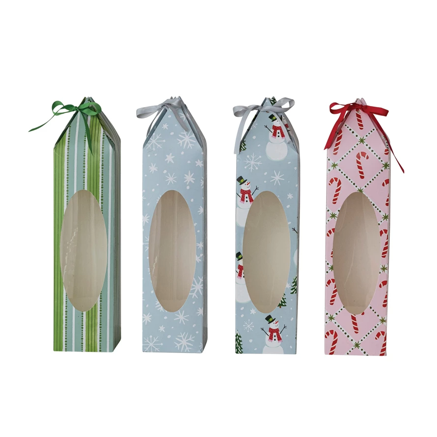 Catalog Name: 3-1/2" Square x 15"H Handmade Printed Recycled Paper Wine/Gift Box w/ Holiday Pattern, Acetate Window & Ribbon Ties, Multi Color, 4 Styles ©
