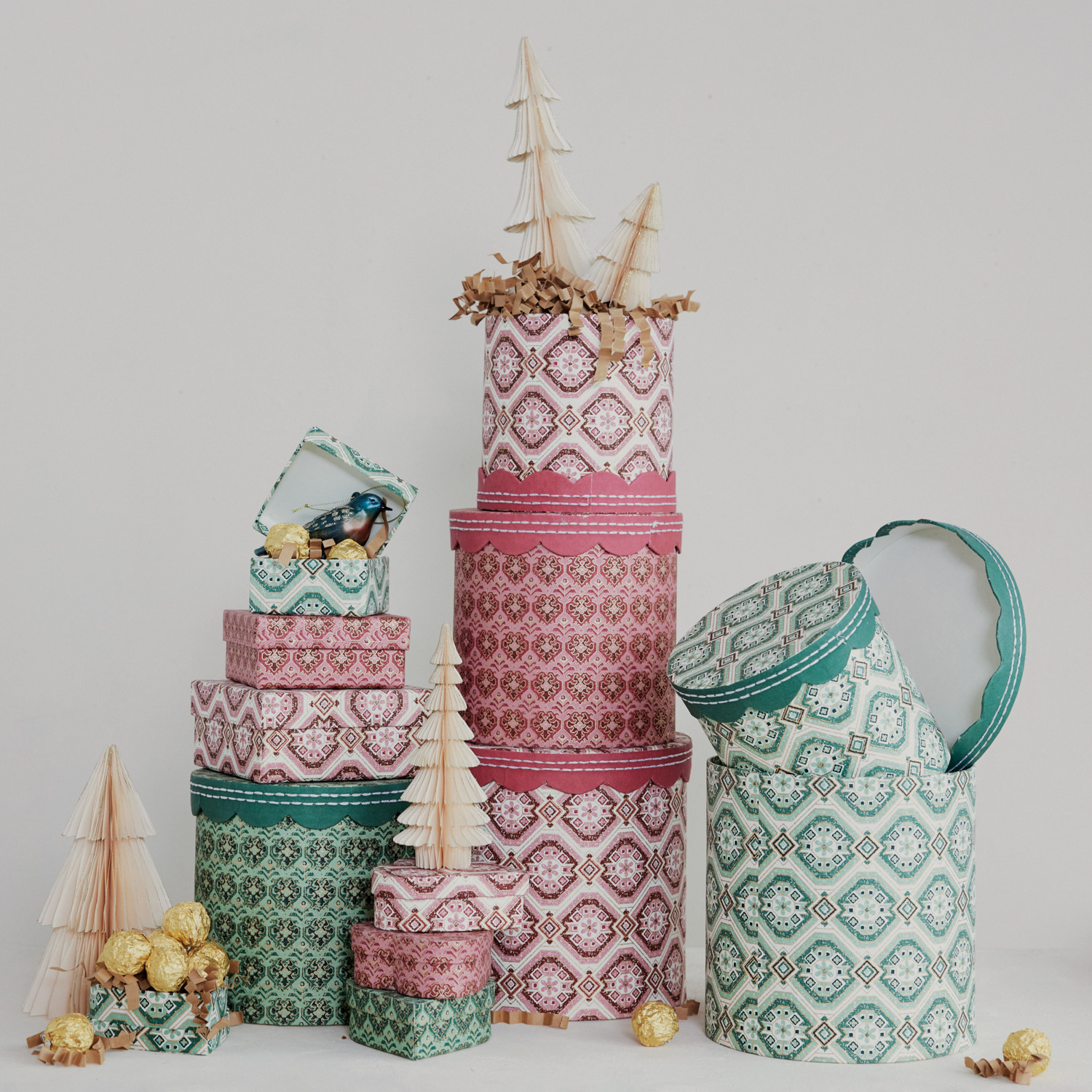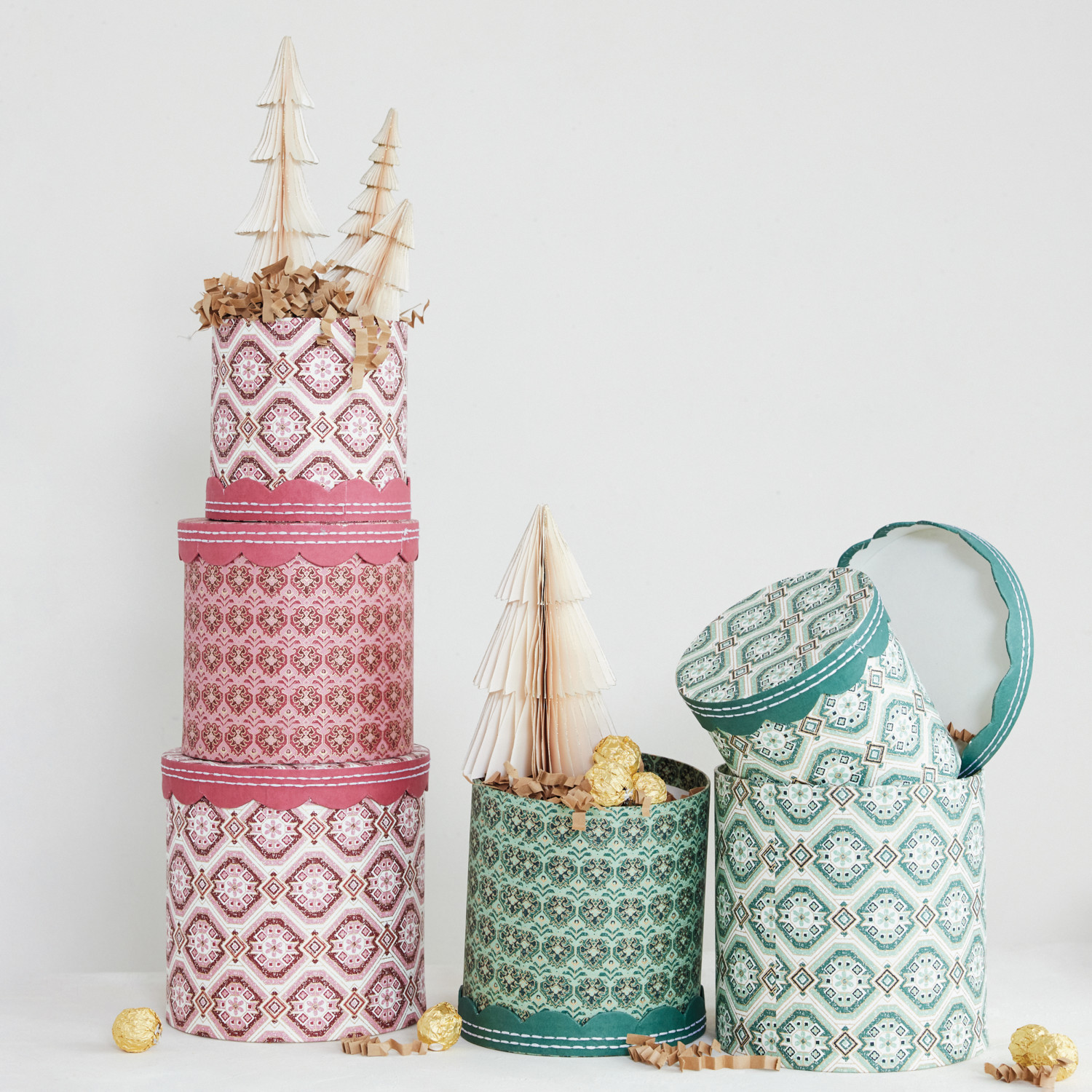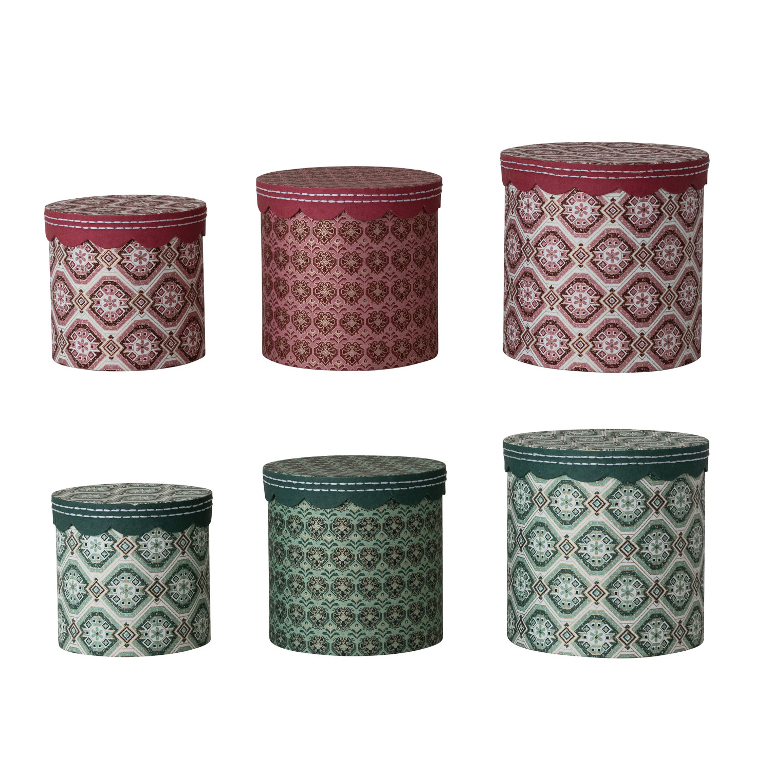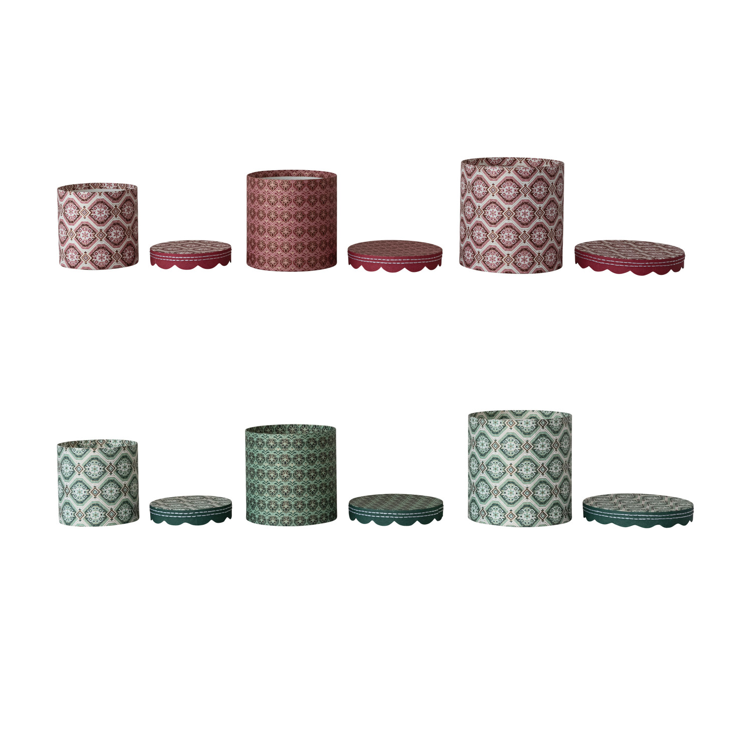 Catalog Name: 8-1/4" Round x 8"H, 7-1/4" Round x 7-1/4"H & 6-1/4" Round x 6"H Handmade Recycled Block Printed Paper Nesting Gift Boxes w/ Patterns & Scalloped Lids, Multi Color, Set of 3, 2 Colors