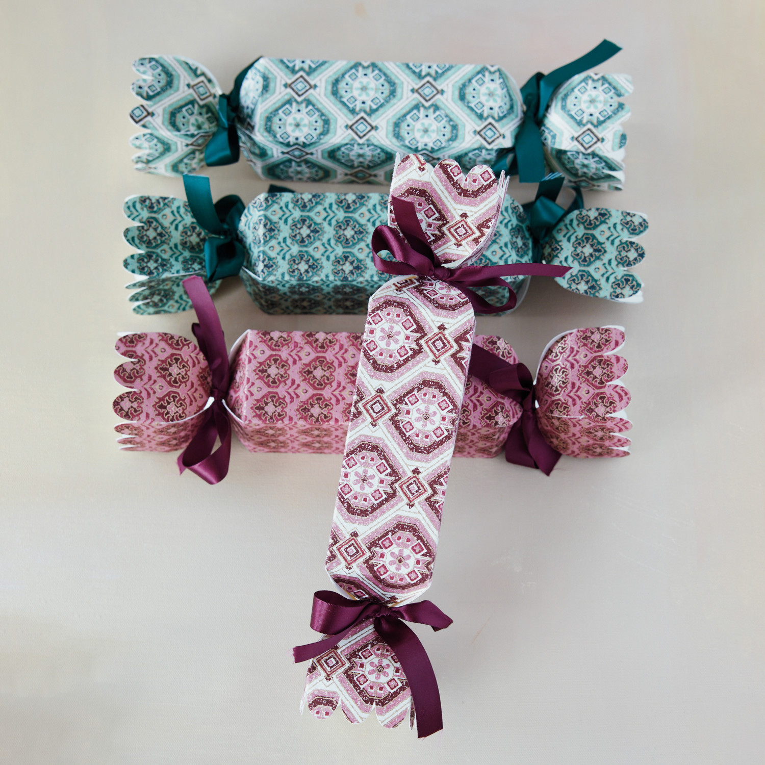 Handmade Recycled Block Printed Paper Candy Shaped Gift Box with Ribbon Ties, 4 Styles