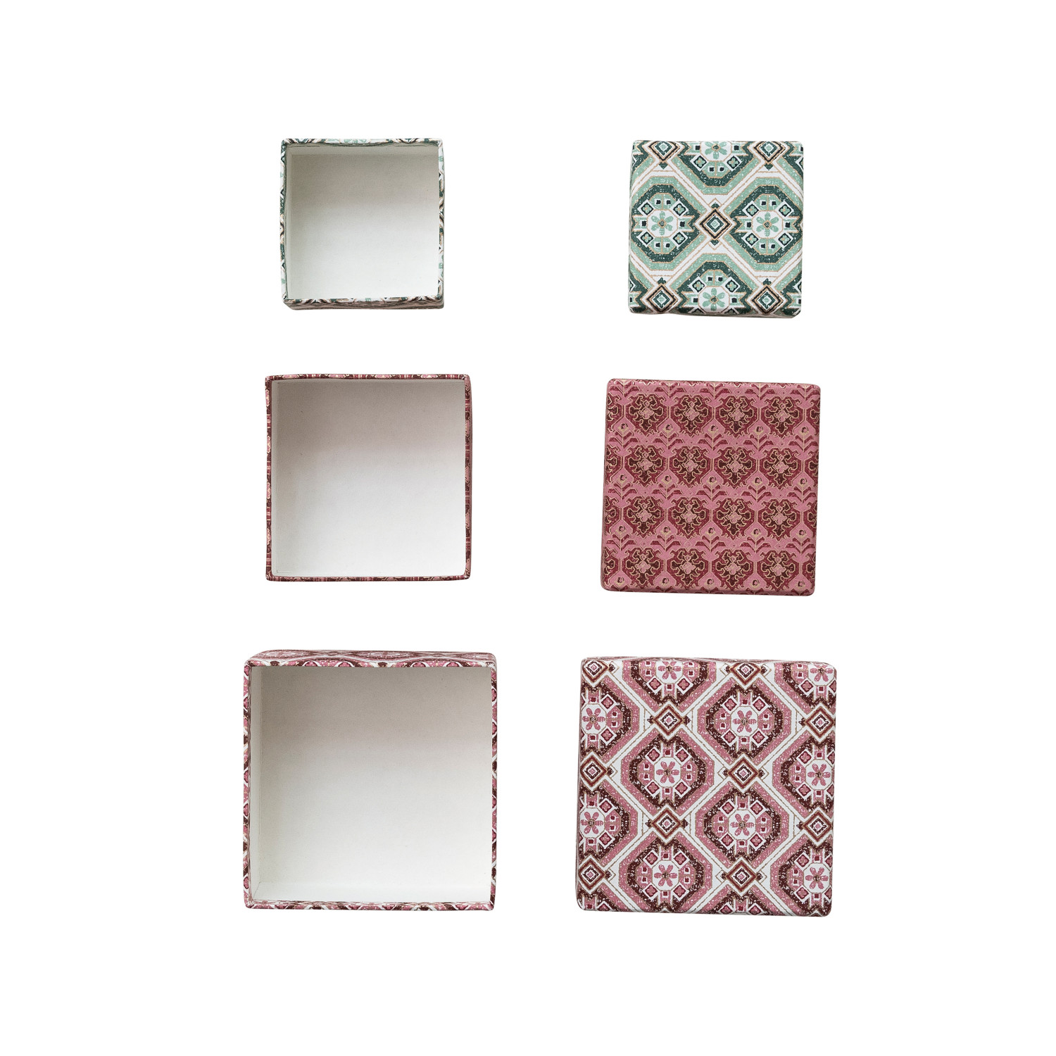 Catalog Name: 5-3/4" Square x 2-3/4"H, 4-3/4" Square x 2-1/4"H & 4" Square x 1-3/4"H Handmade Recycled Block Printed Paper Nesting Gift Boxes w/ Patterns, Multi Color, Set of 3