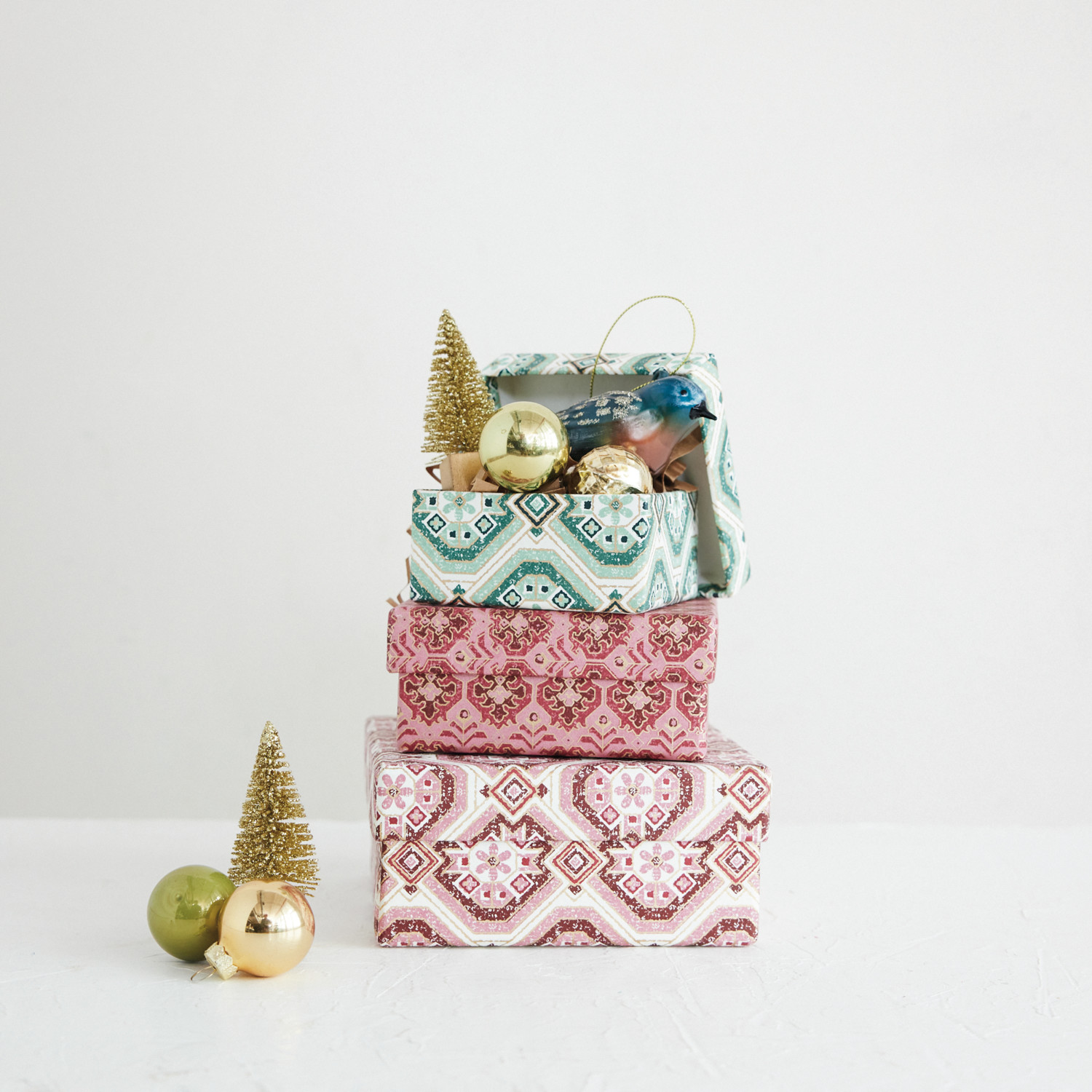 Handmade Recycled Block Printed Paper Nesting Gift Boxes with Patterns, Set of 3