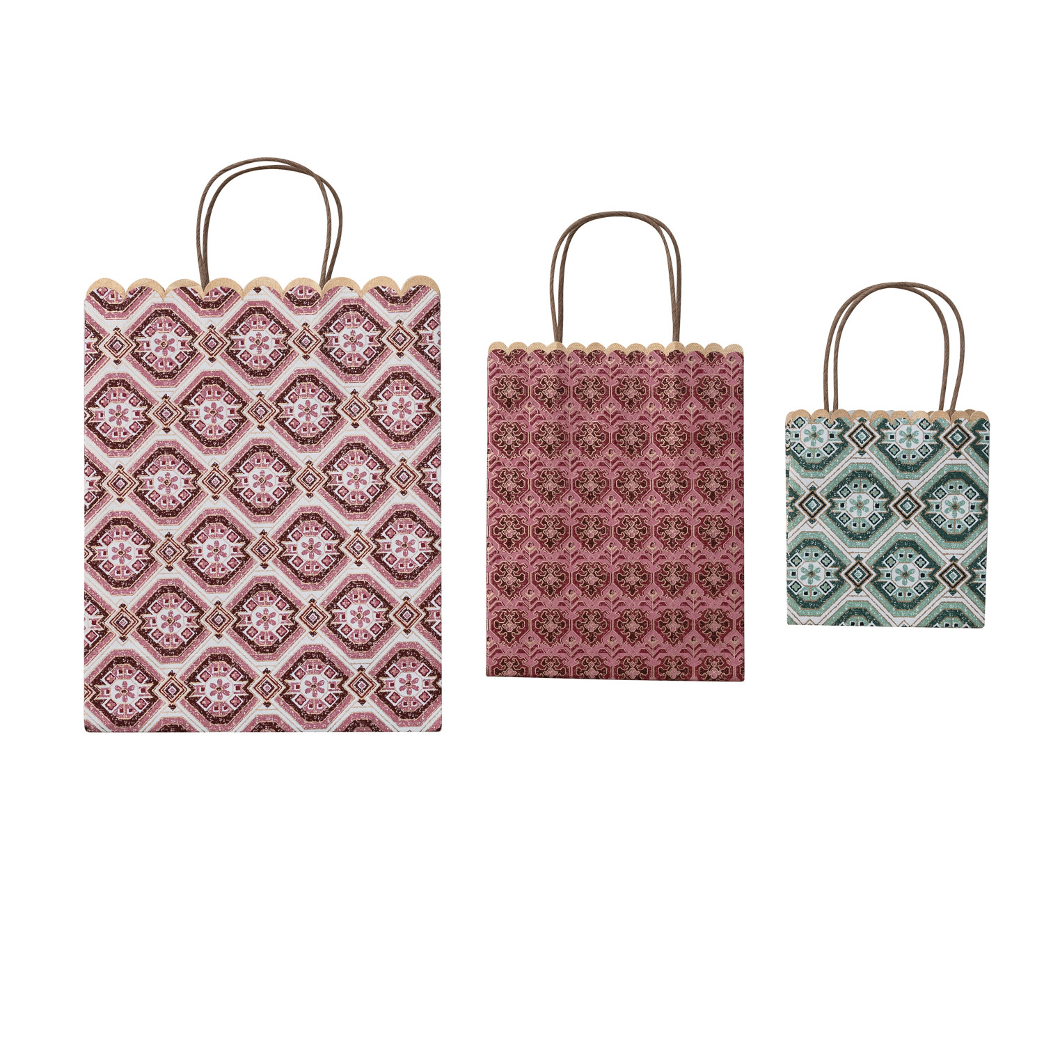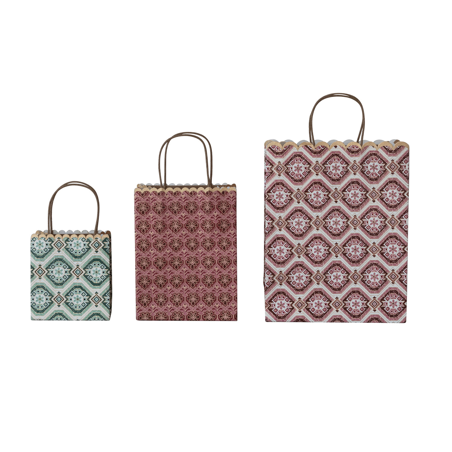 Catalog Name: 9"L x 4"W x 11-1/2"H, 6-1/2"L x 3-1/2"W x 8-1/2"H & 5"L x 3"W x 5-1/2"H Handmade Recycled Block Printed Scalloped Paper Gift Bags w/ Patterns, Multi Color, Set of 3