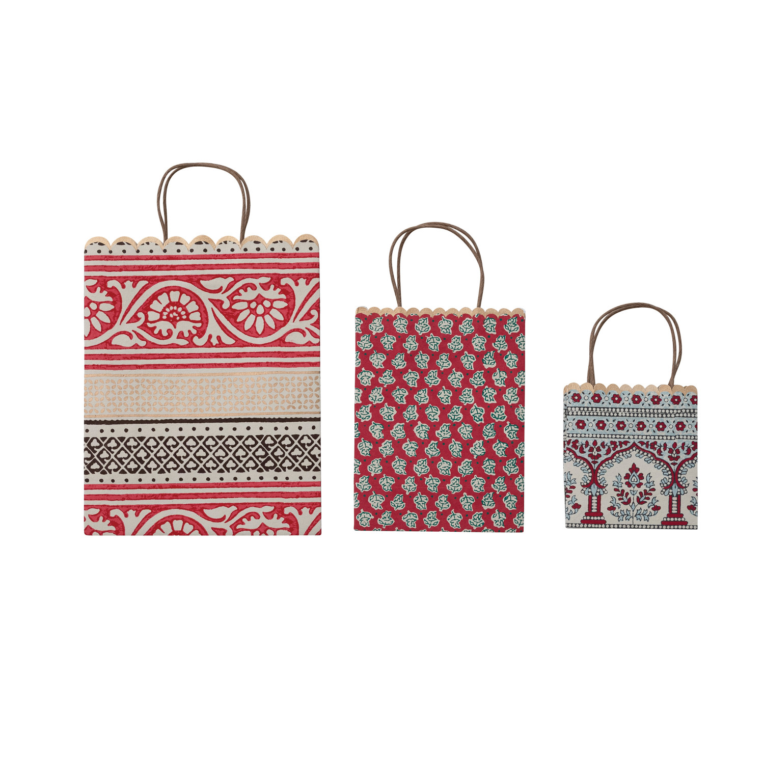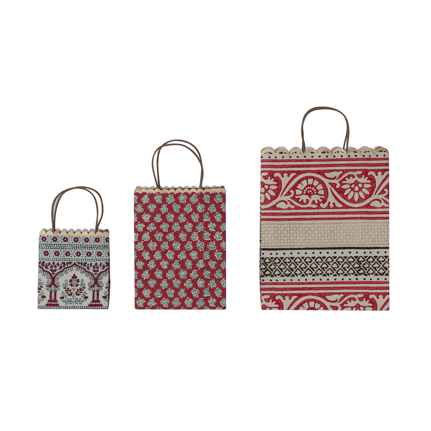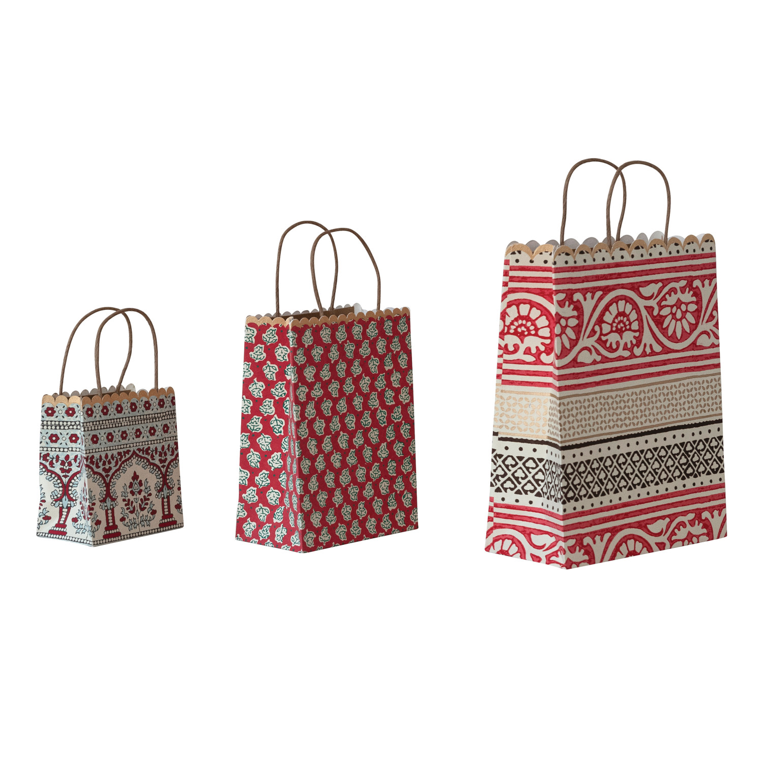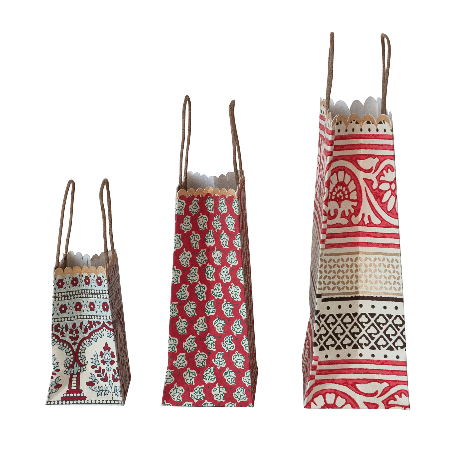 Catalog Name: 9"L x 4"W x 11-1/2"H, 6-1/2"L x 3-1/2"W x 8-1/2"H & 5"L x 3"W x 5-1/2"H Handmade Recycled Block Printed Scalloped Paper Gift Bags w/ Vintage Patterns, Multi Color, Set of 3
