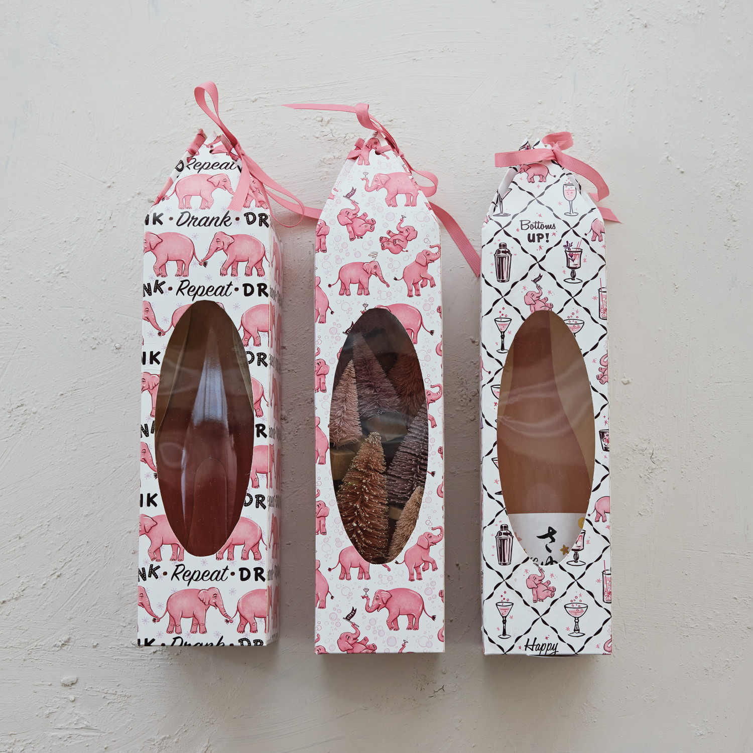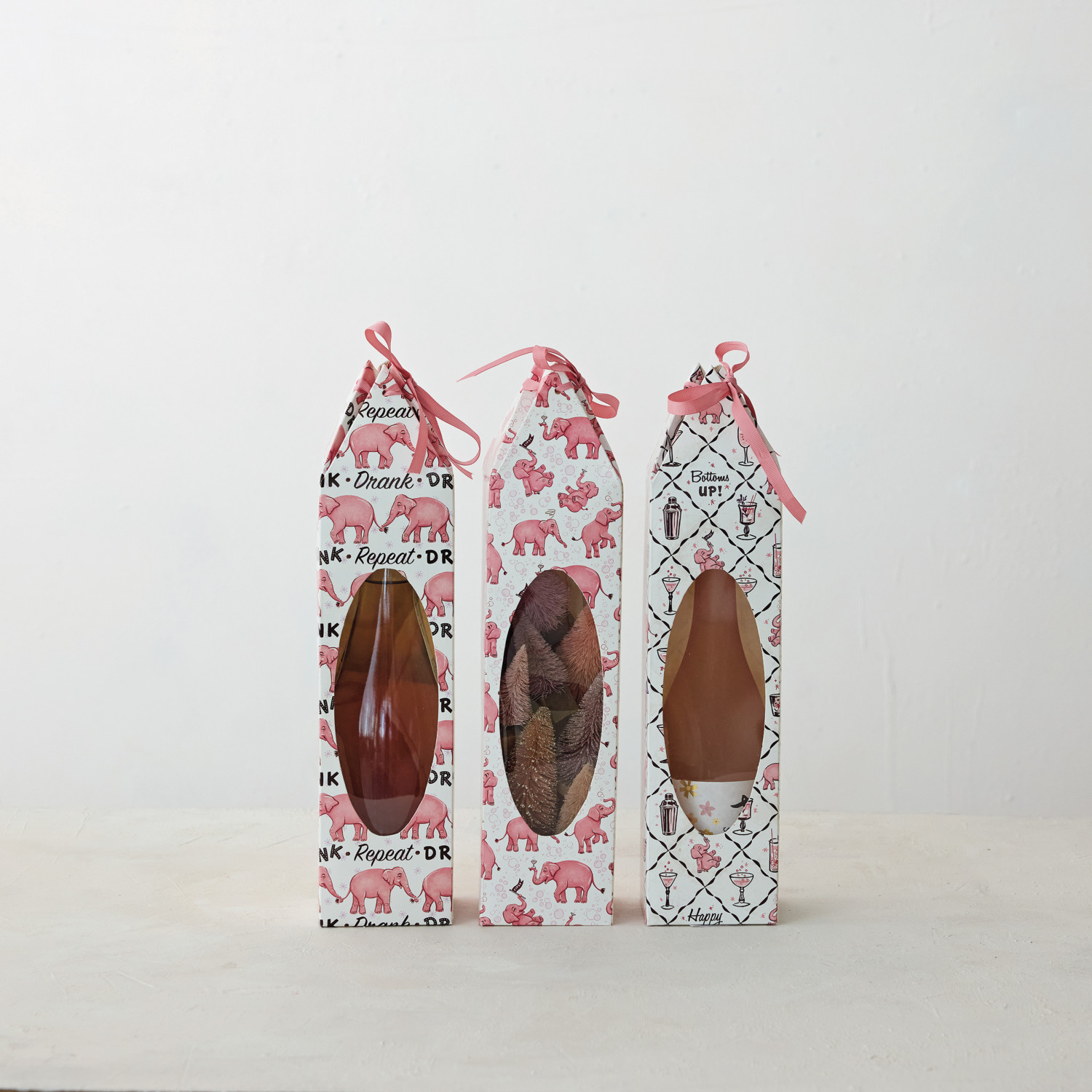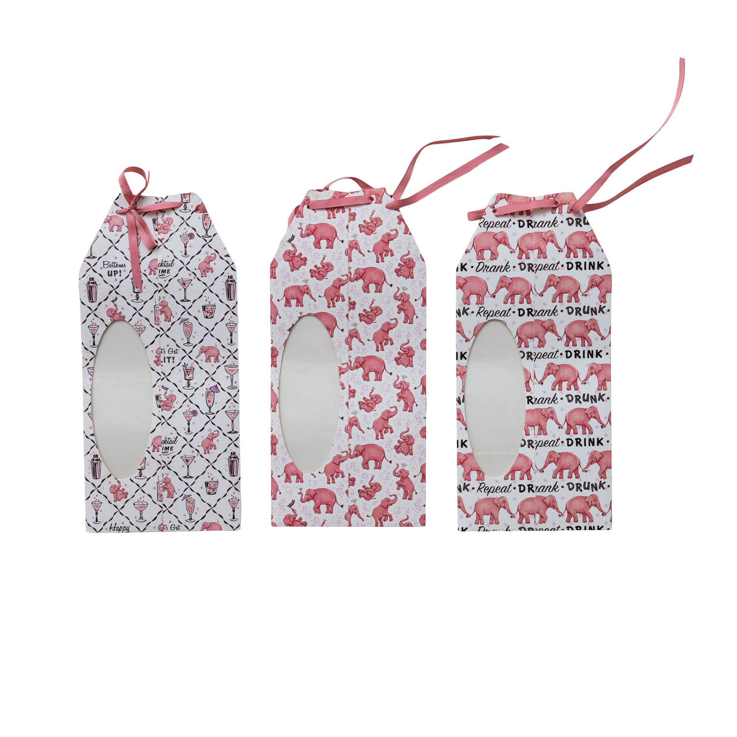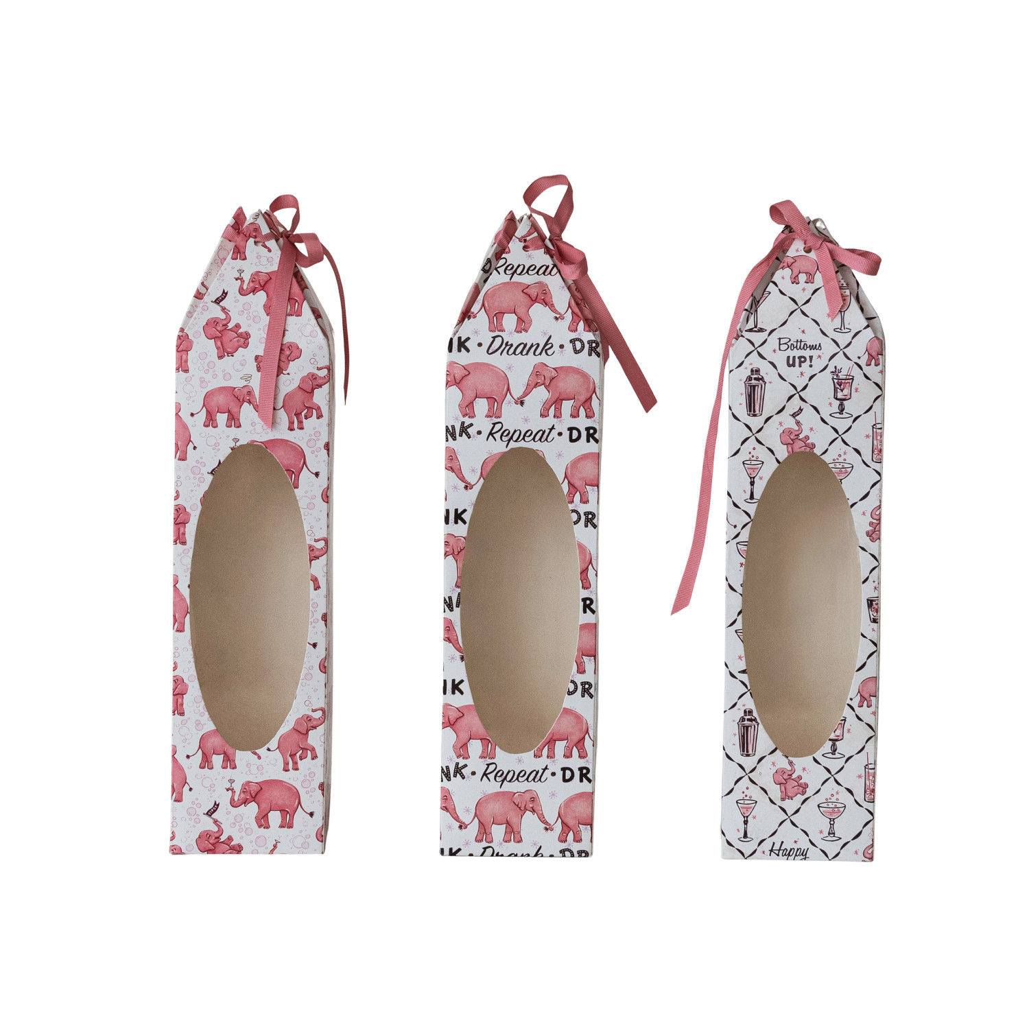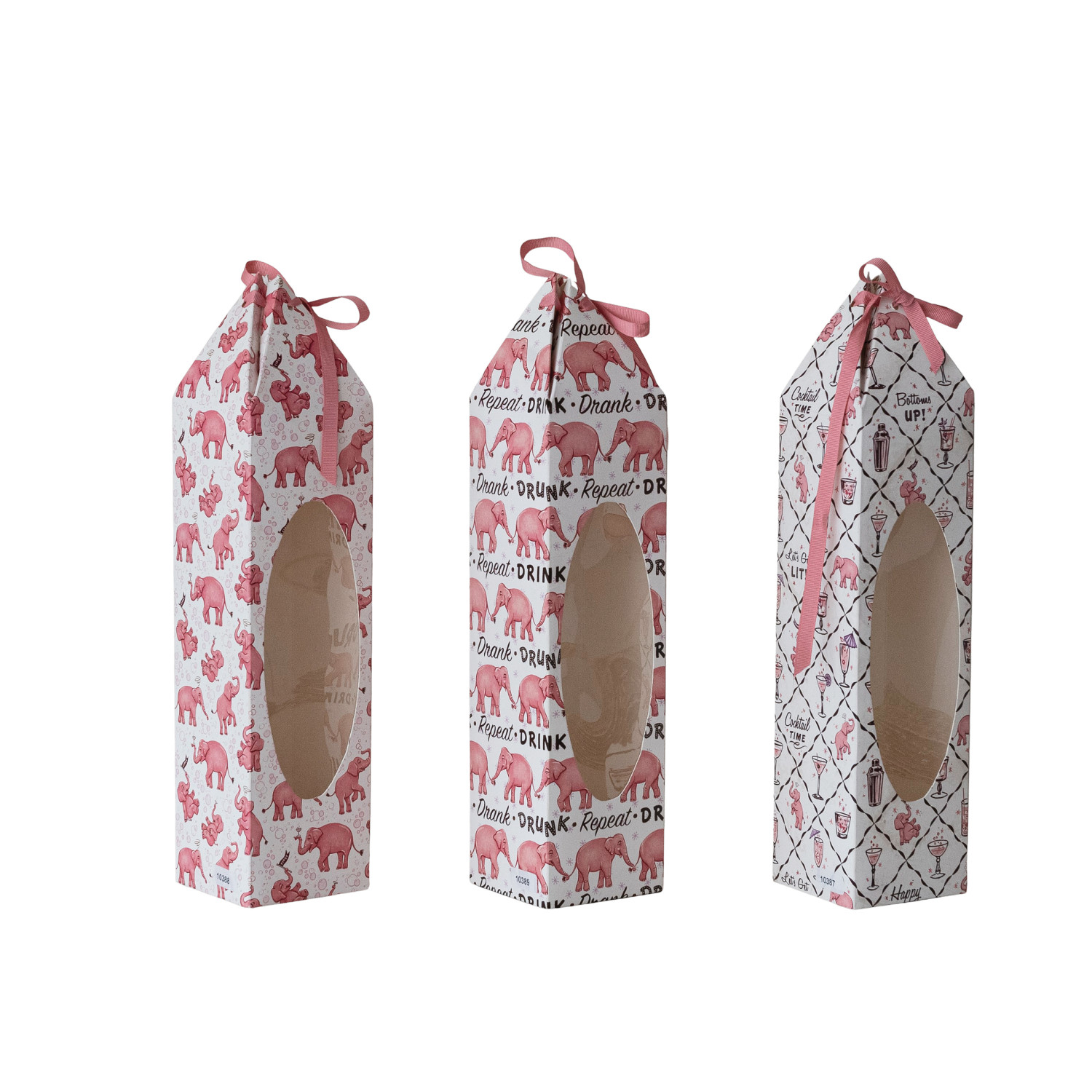 Catalog Name: 3-1/2" Square x 15"H Handmade Printed Recycled Paper Wine/Gift Box w/ Pink Elephant Pattern, Acetate Window & Ribbon Ties, Multi Color, 3 Styles ©