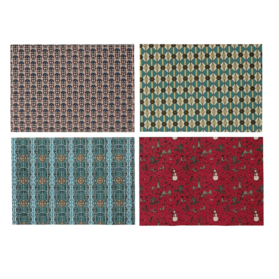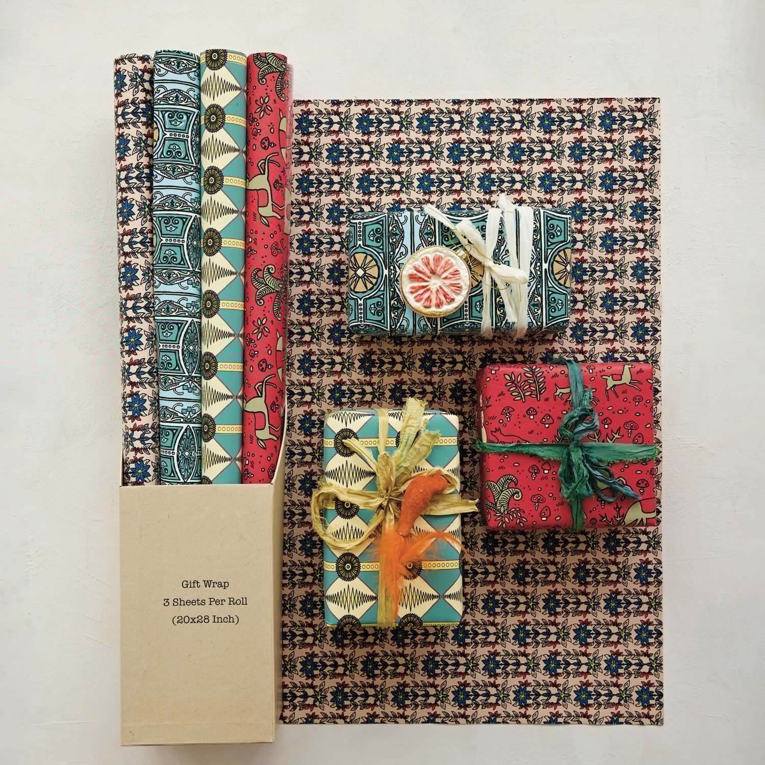 Catalog Name: 28"L x 20"W Handmade Printed Recycled Wrapping Paper Sheets w/ Patterns, Multi Color, Set of 12 Rolls in Kraft Display Box (4 Styles, 3 Rolls Per Style, 3 Sheets Per Roll) ©