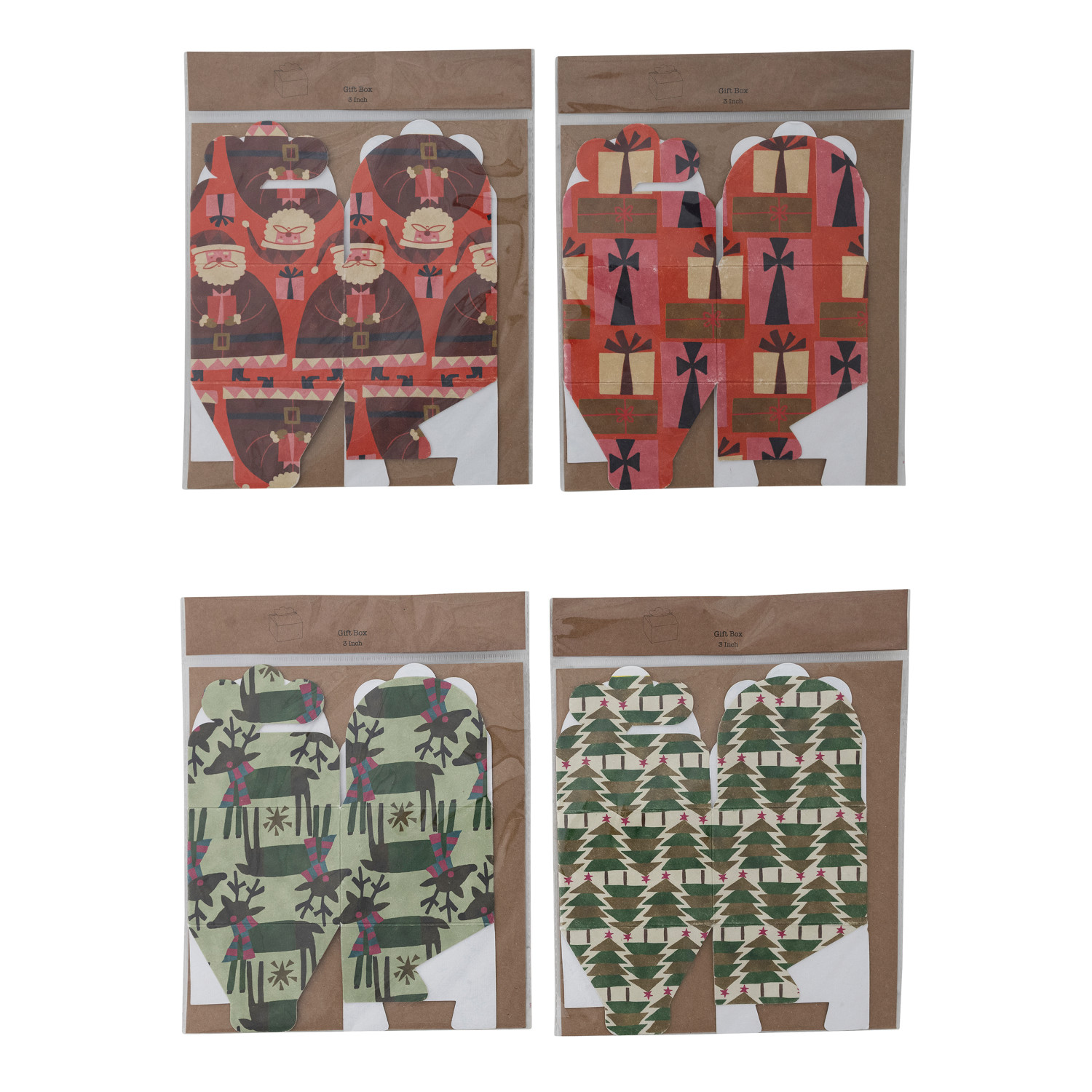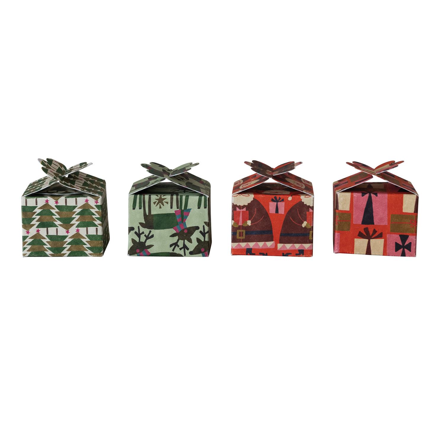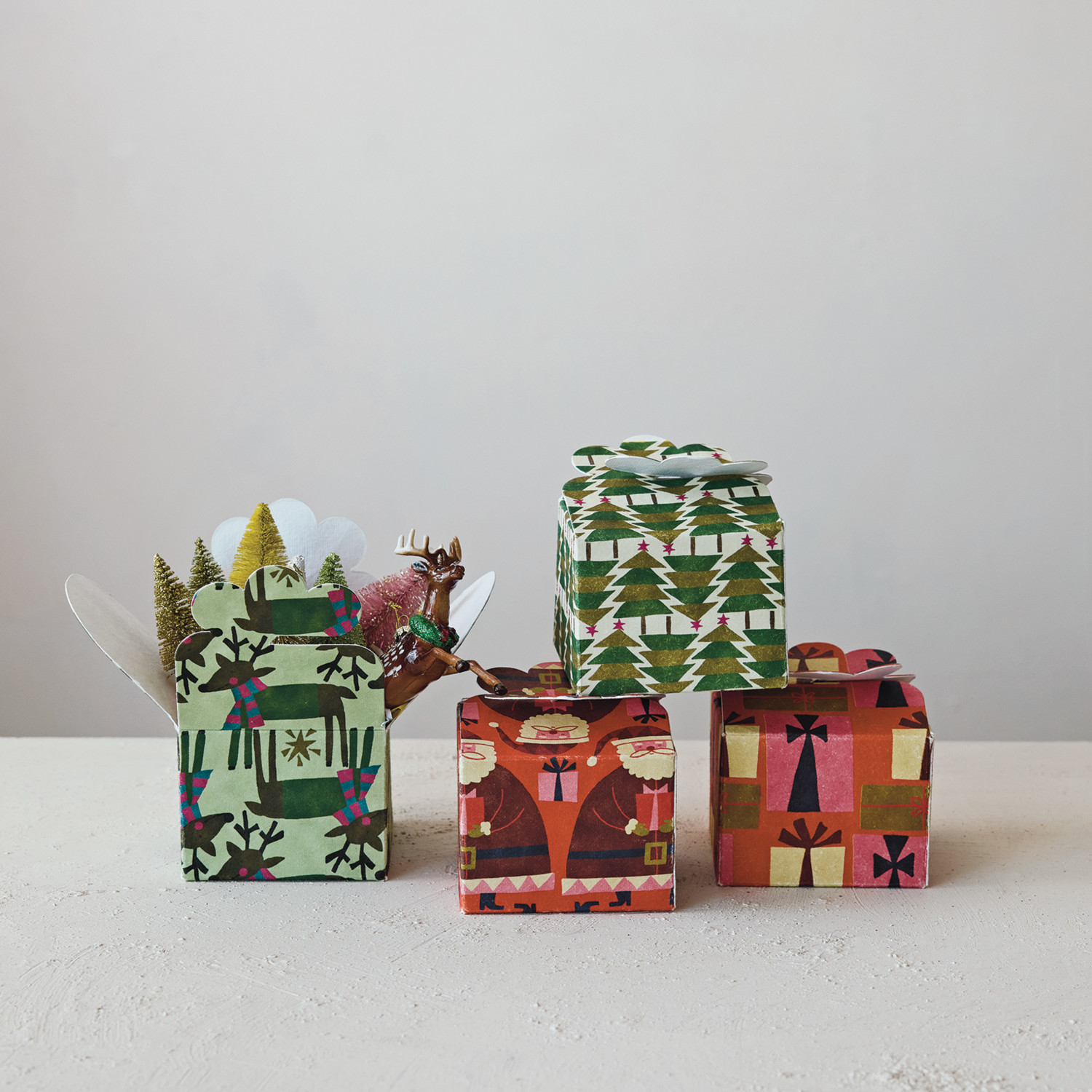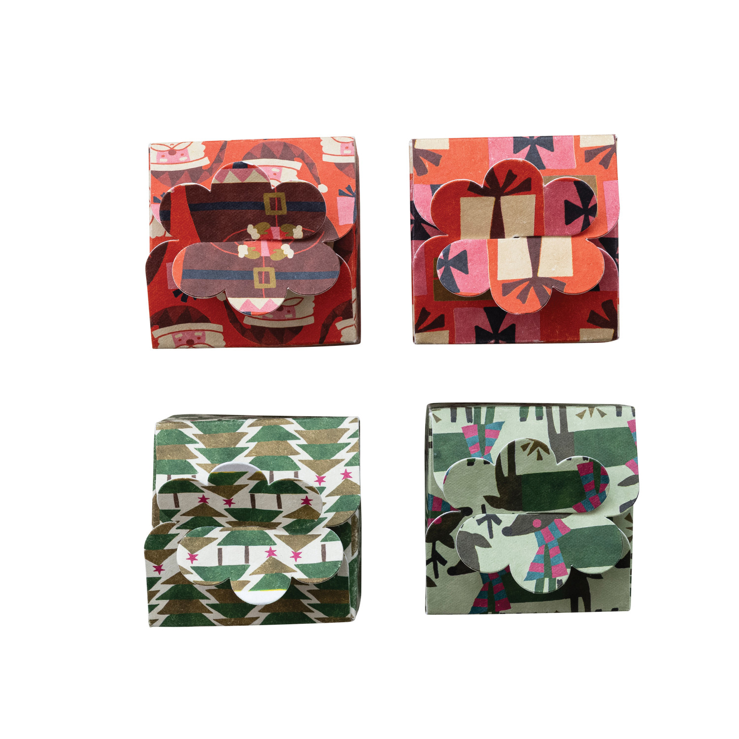 Catalog Name: 4" Square x 3"H Handmade Printed Recycled Paper Interlocking Gift Box w/ Holiday Pattern, Multi Color, 4 Styles ©