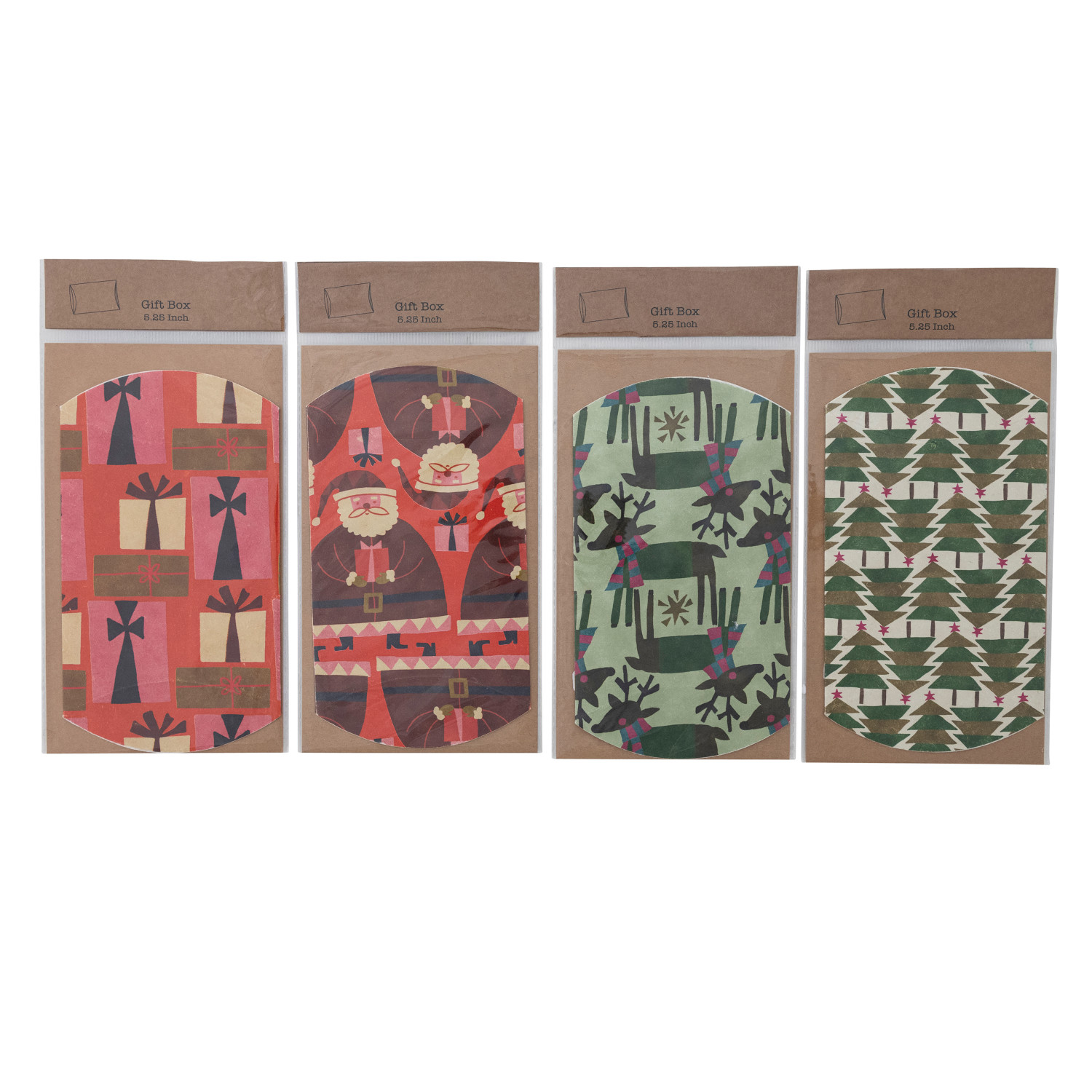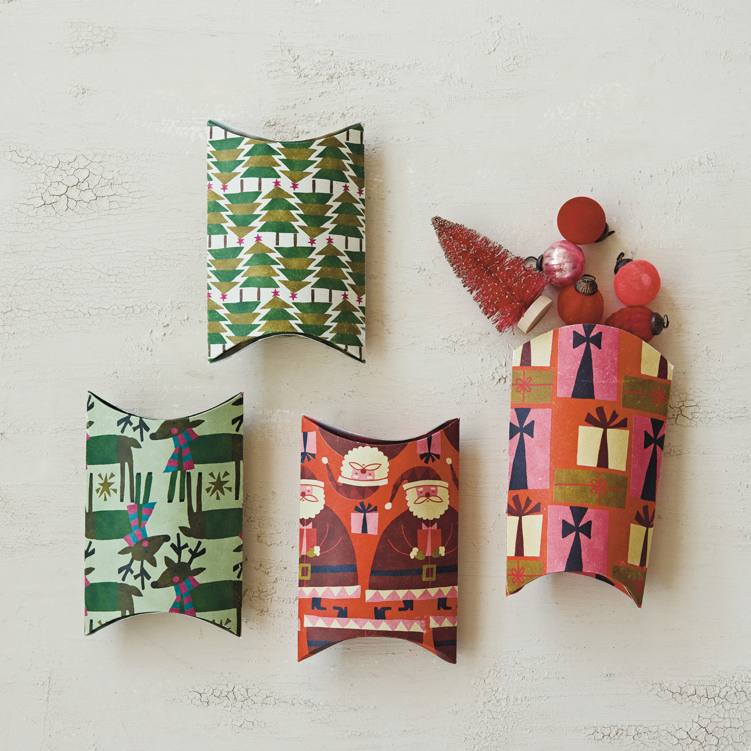Catalog Name: 6-3/4"L x 4-1/4"W x 1-1/2"H Handmade Printed Recycled Paper Pillow Gift Box w/ Holiday Pattern, Multi Color, 4 Styles ©