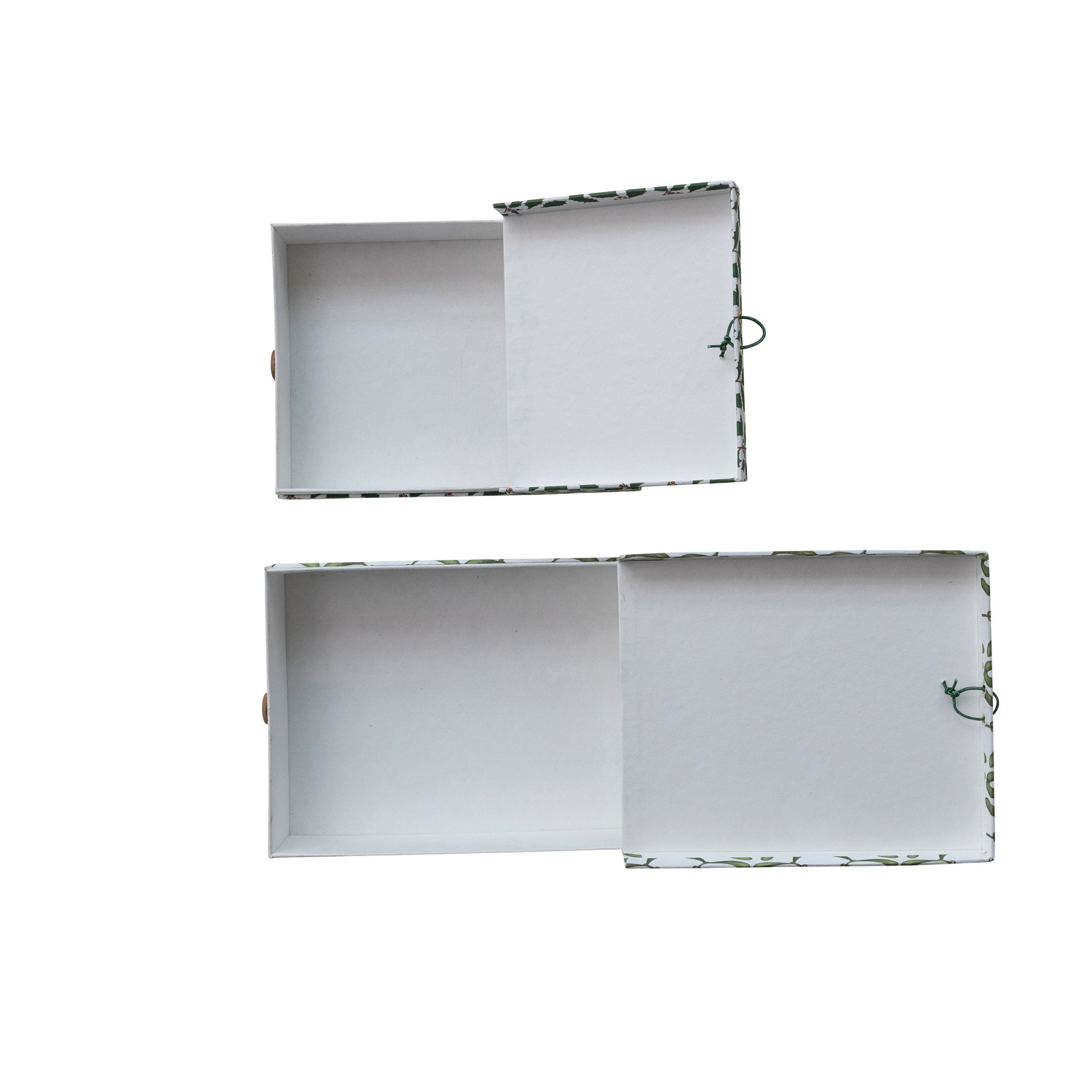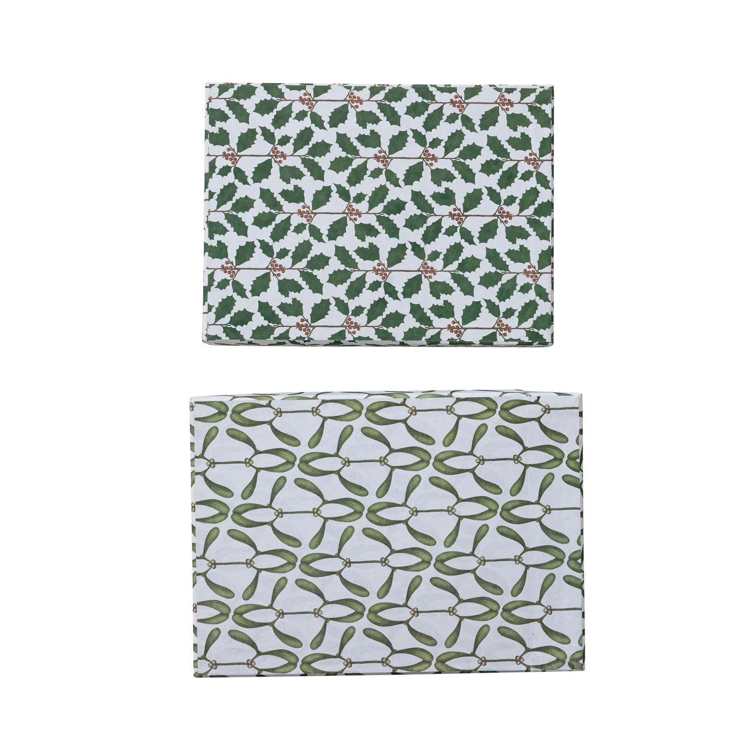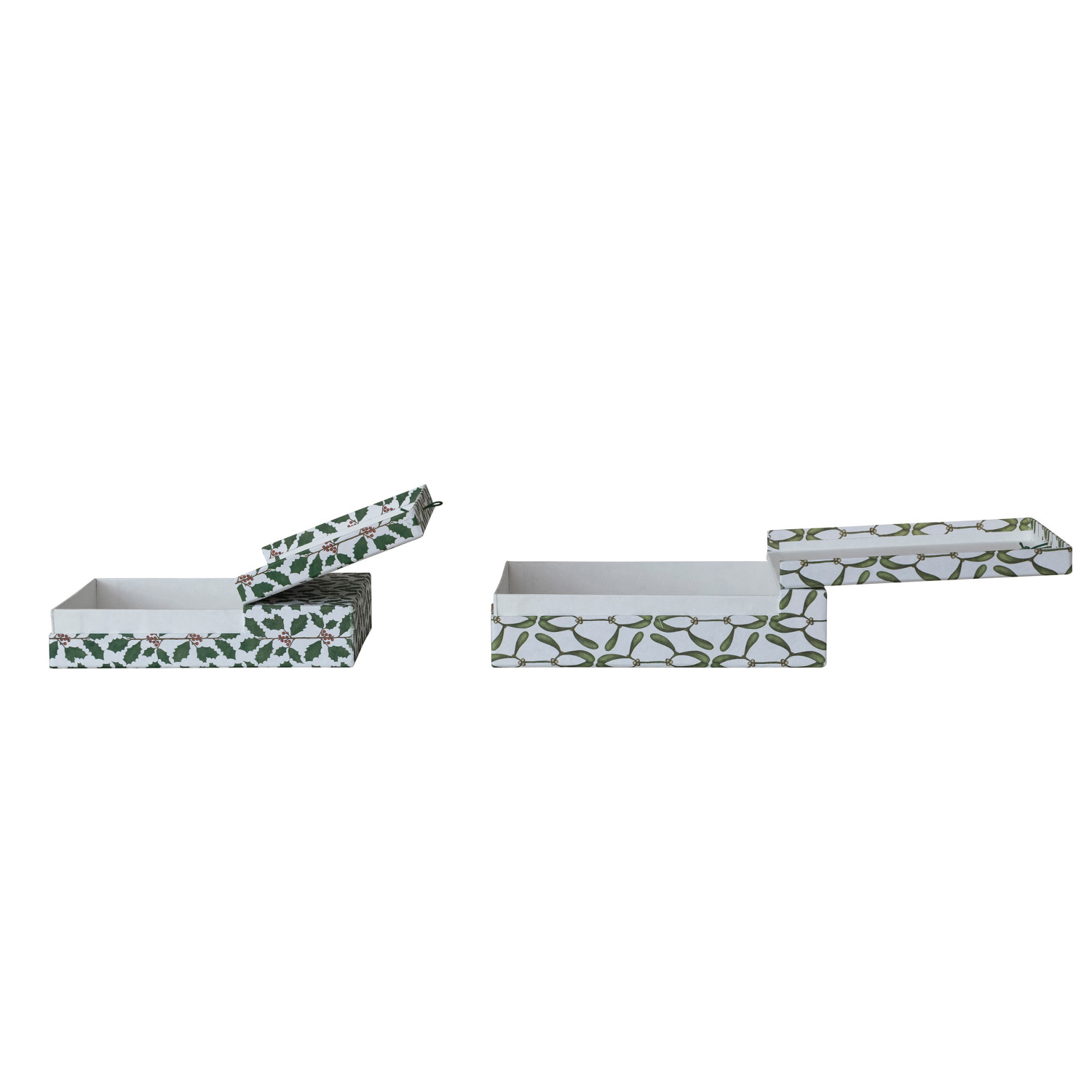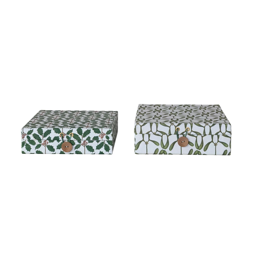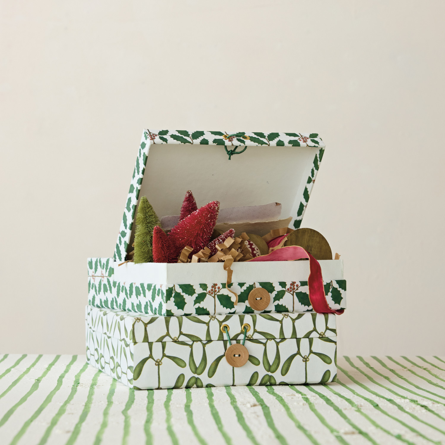 Printed Paper Gift Boxes with Mistletoe/Holly Patterns & Wood Button Closures, Set of 2 ©