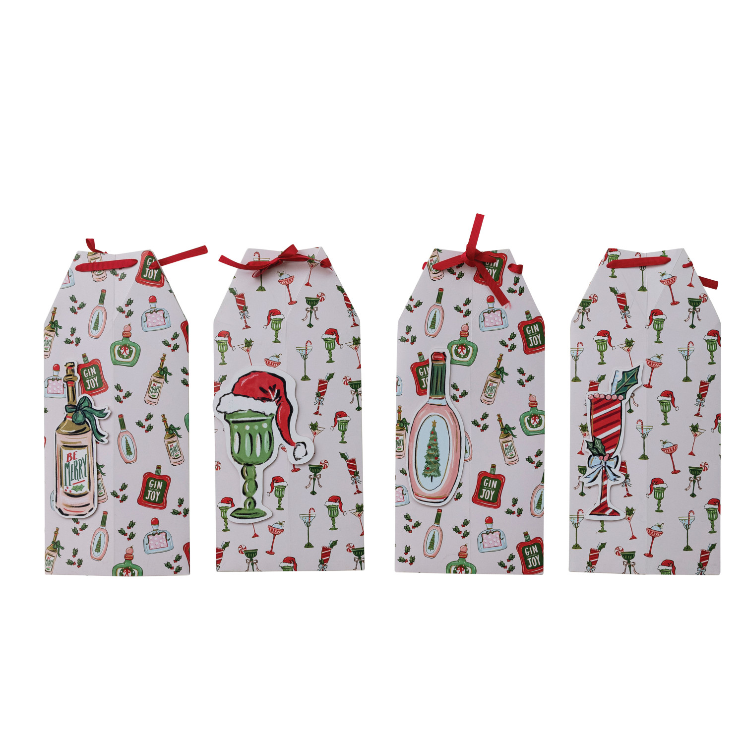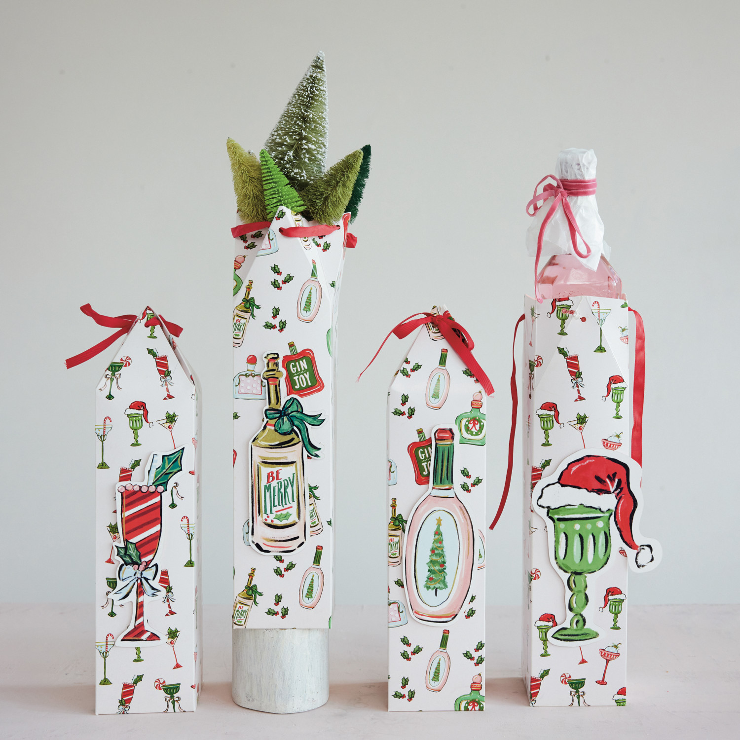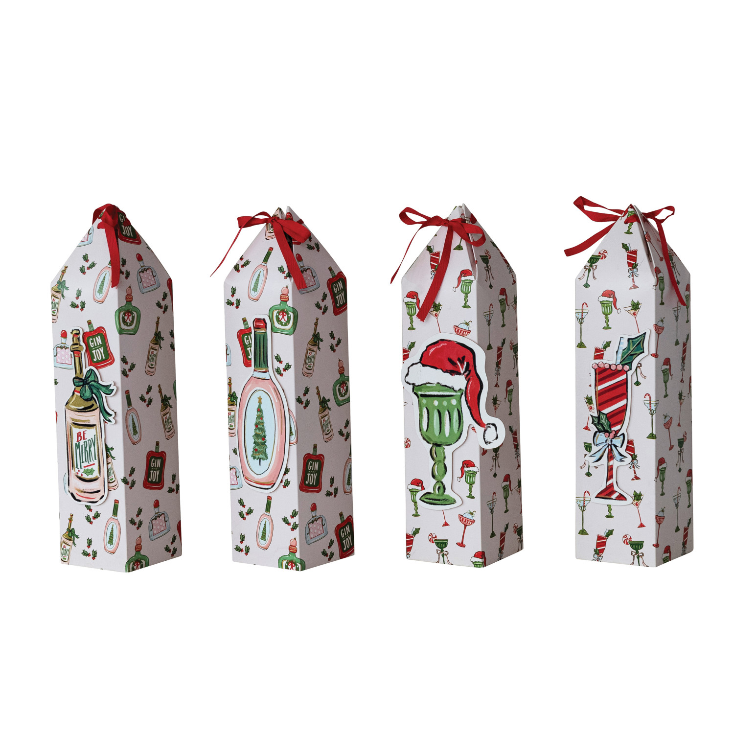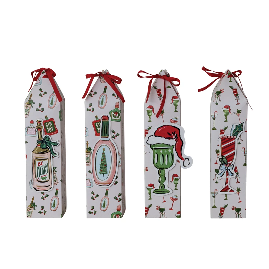 Catalog Name: 3-1/2" Square x 15"H Handmade Printed Recycled Paper Wine/Gift Box w/ Pattern, 3D Cocktail/Bottle & Ribbon Ties, Multi Color, 4 Styles