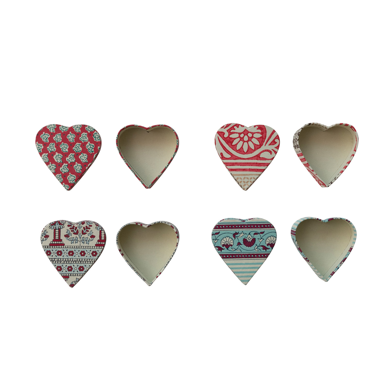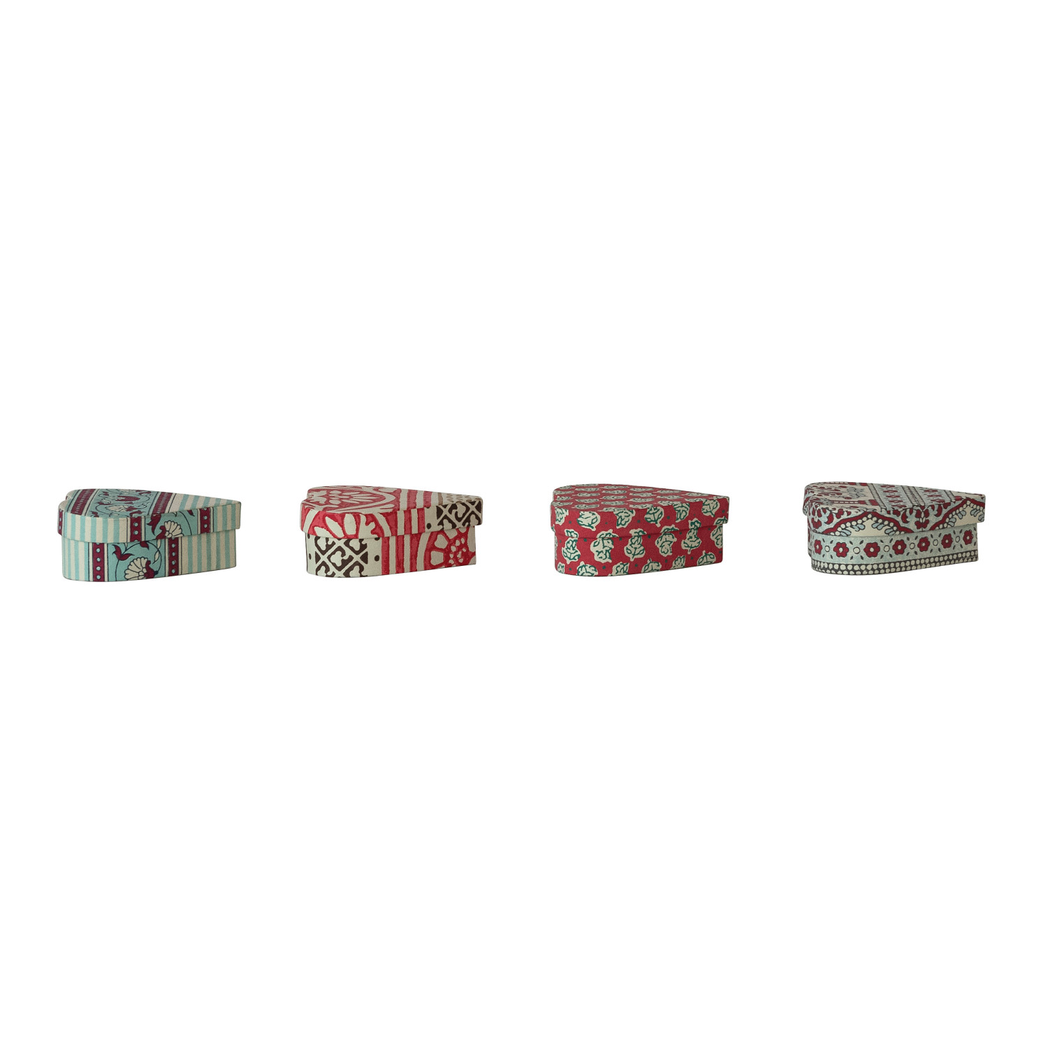 Catalog Name: 4-1/4"L x 4-1/4"W x 1-3/4"H Handmade Recycled Block Printed Paper Heart Shaped Gift Box w/ Vintage Pattern, Multi Color, 4 Styles