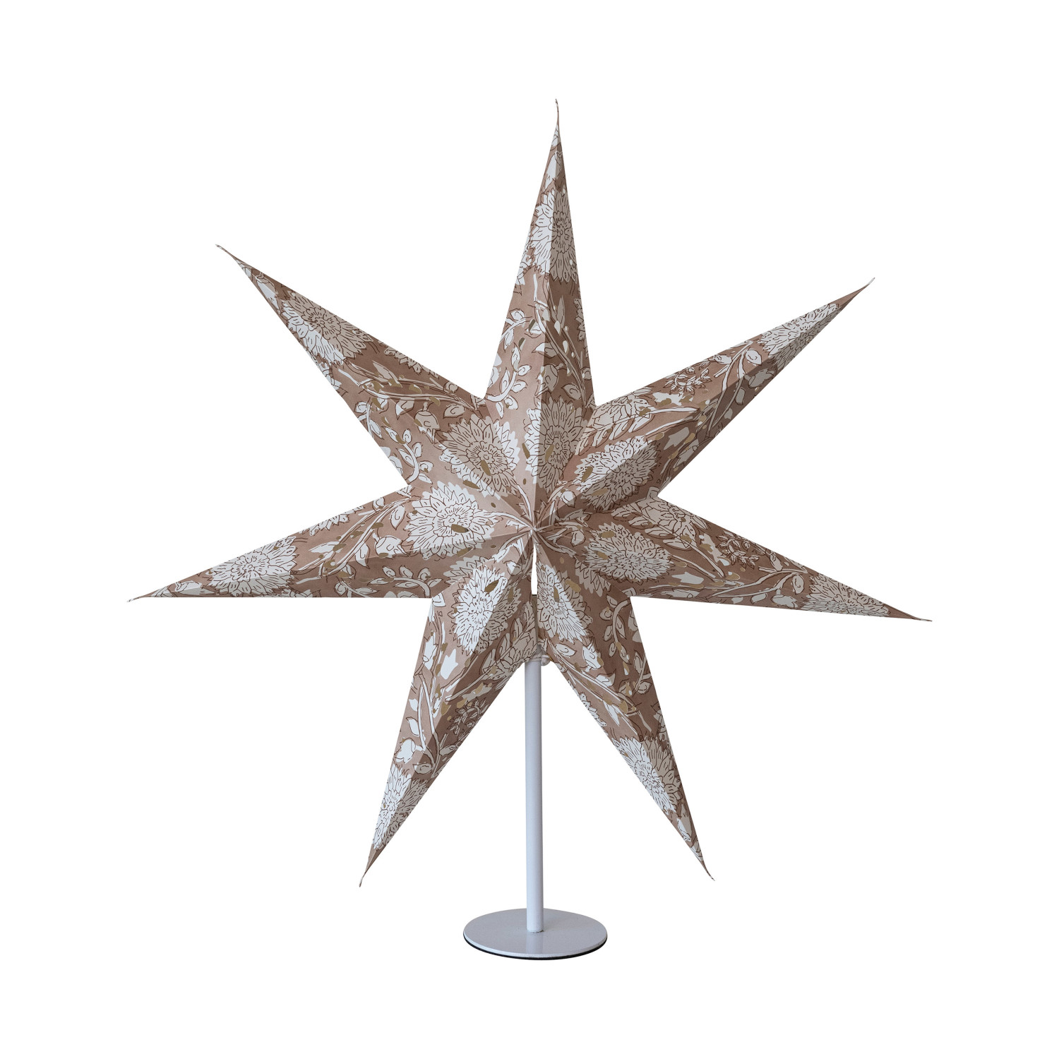 Catalog Name: 24"L x 7-1/2"W x 25"H Printed Recycled Paper Folding Star w/ Pattern, LED Light String & White Metal Stand, Brown & Cream Color (3-AA Batteries Required)