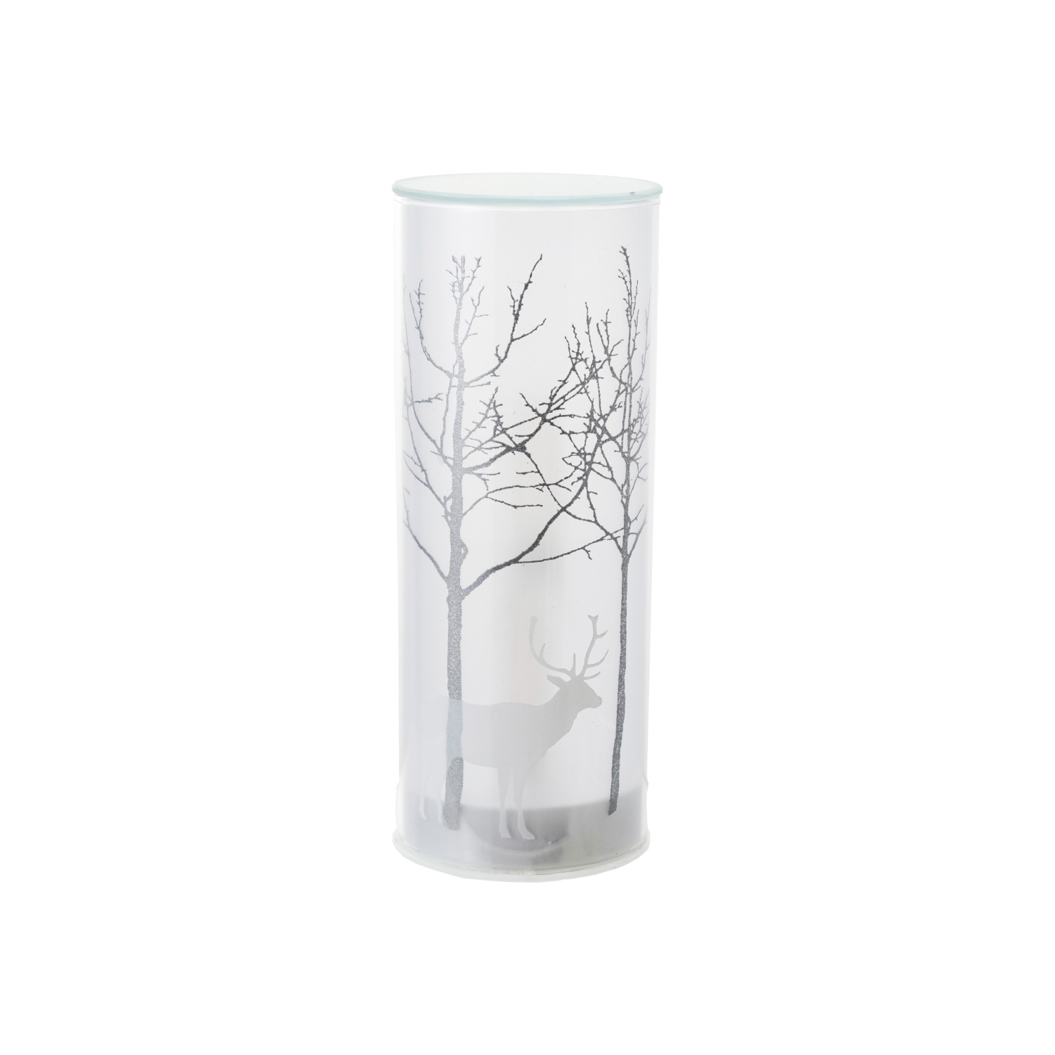 Catalog Name: 3" Round x 8"H Glass LED Motion Light w/ Trees & Reindeer Image, White & Silver Finish (Requires 3-AA Batteries)