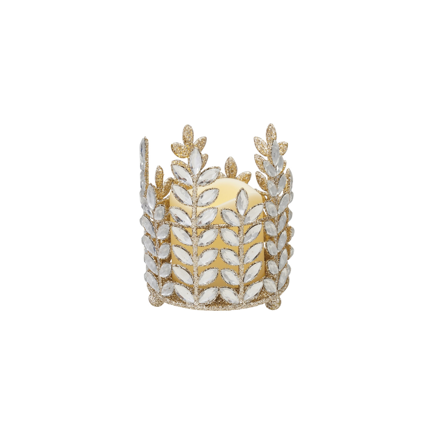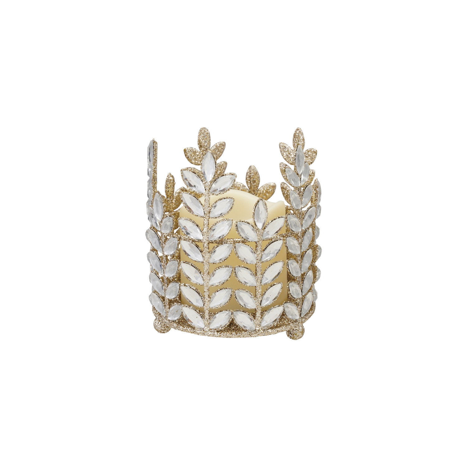 Catalog Name: 4-3/4" Round x 5-1/4"H Metal Votive Holder w/ Acrylic Jewels, Glitter & LED Candle, Champagne Finish, Set of 2 (Requires 3-AAA Batteries)