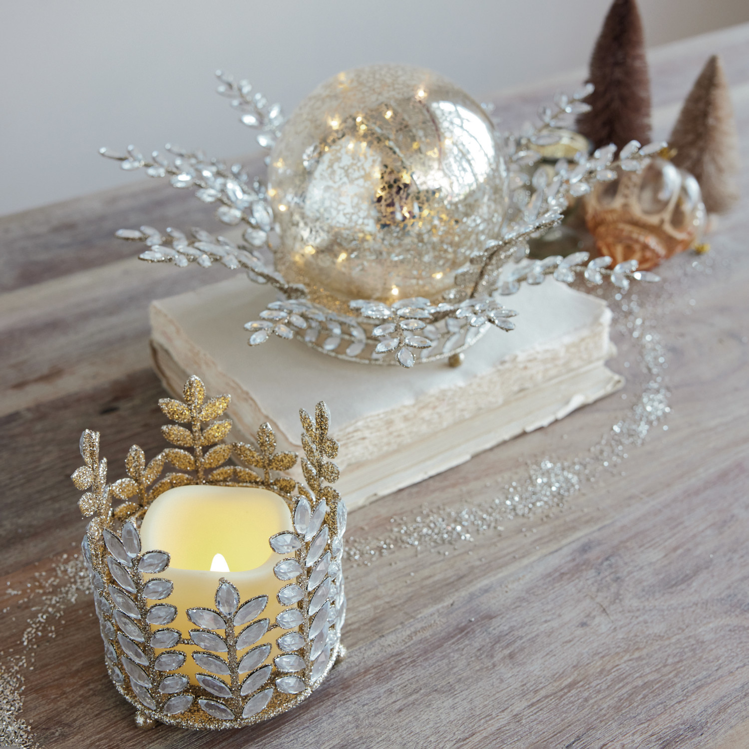 Metal Votive Holder with Acrylic Jewels, Glitter & LED Candle, Set of 2