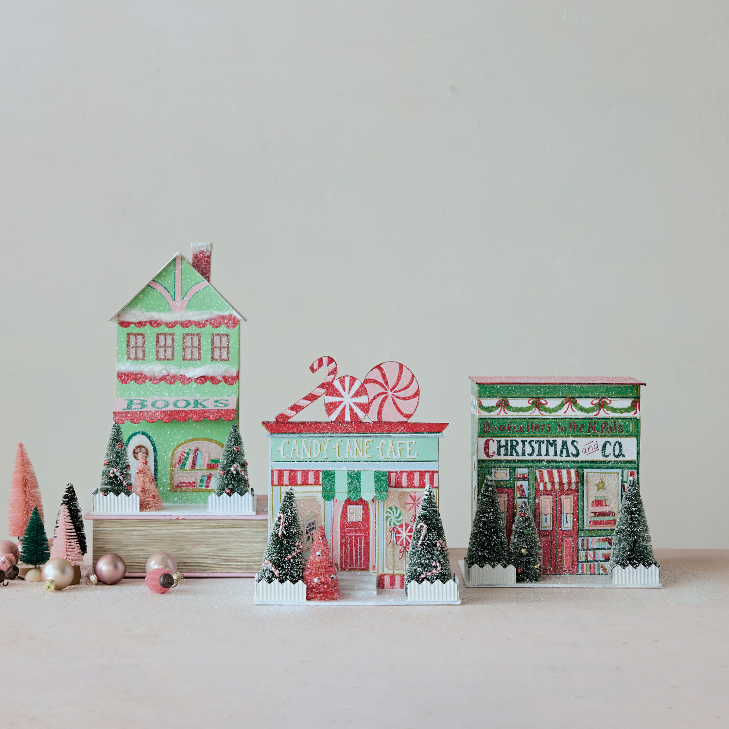 Catalog Name: 8-3/4"H - 12"H Paper Christmas Village Store w/ Sisal Bottle Brush Trees, Glitter & LED Light, 3 Styles (Batteries Included) ©