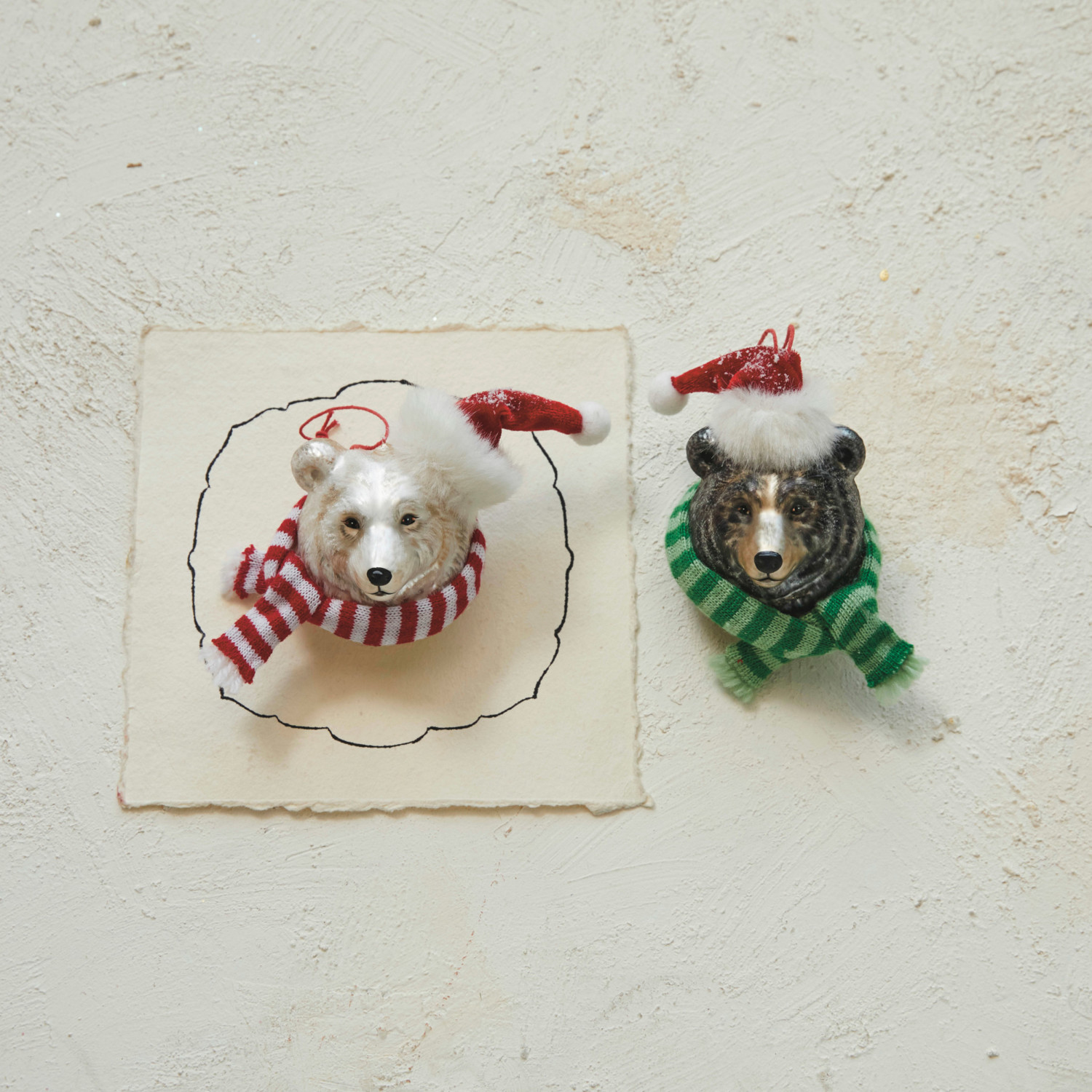 Hand-Painted Glass & Fabric Bear Ornament w/ Scarf & Santa Hat, 2 Styles ©