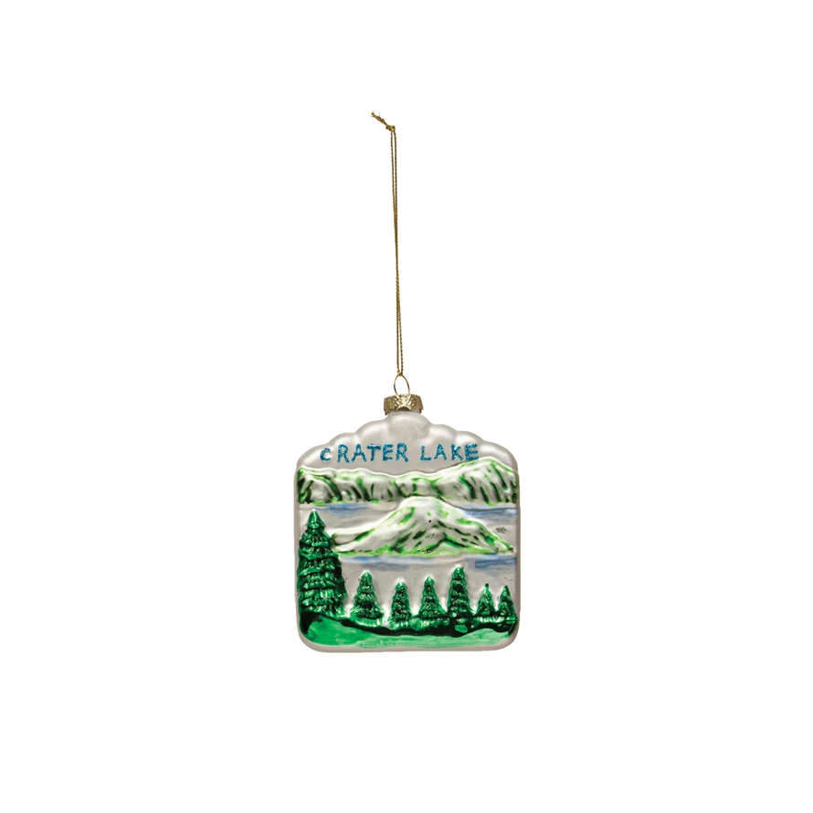 This souvenir-inspired glass crater lake ornament features intricately hand-painted details accented with glitter. Ornaments can be showcased as decorations on a Christmas tree, wreath, or atop a festive centerpiece, hung from doorways, displayed on mantels, used to embellish cards and presents, or given as gifts.