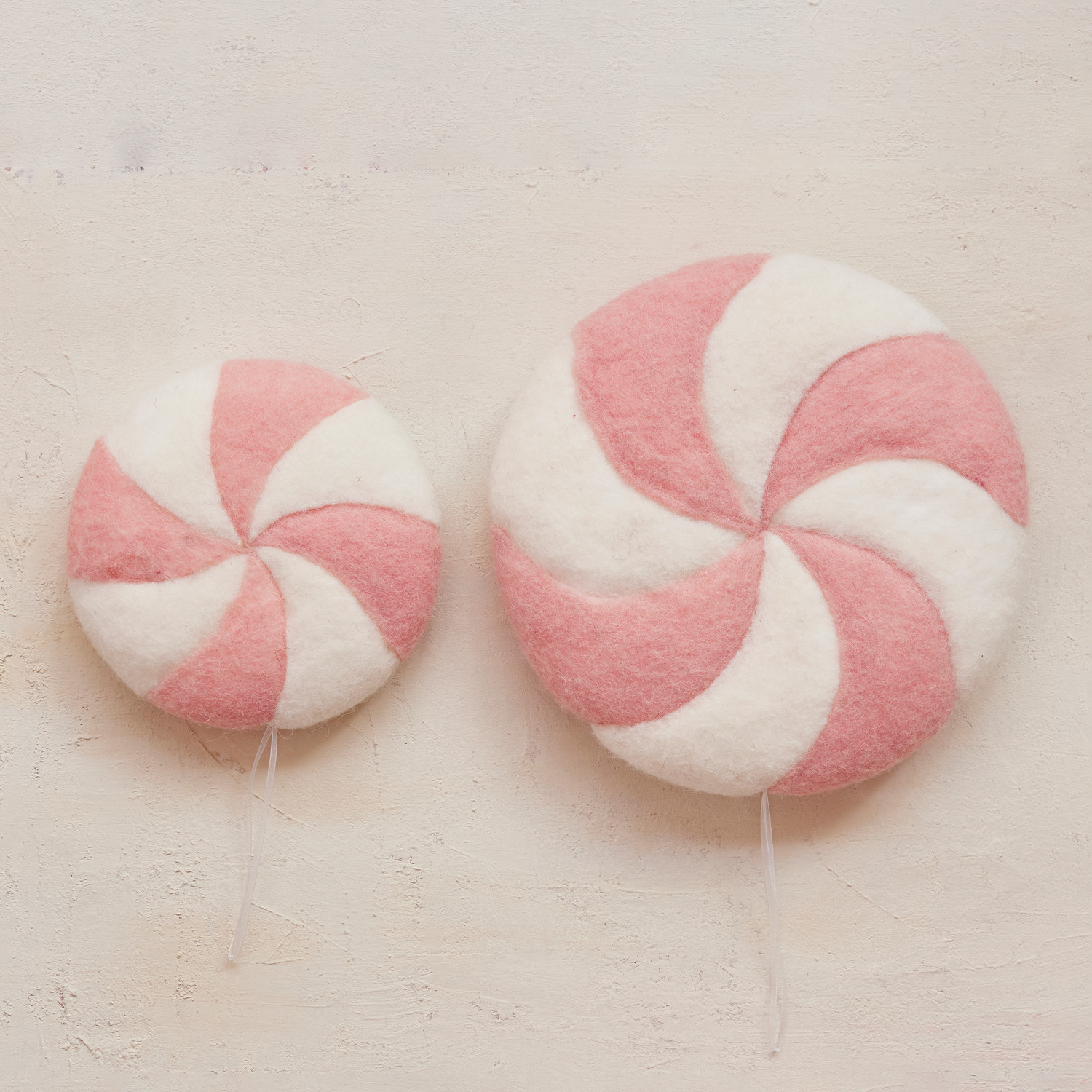 Catalog Name: 10-1/4" Round Handmade Wool Felt Candy Ornament, Pink & White