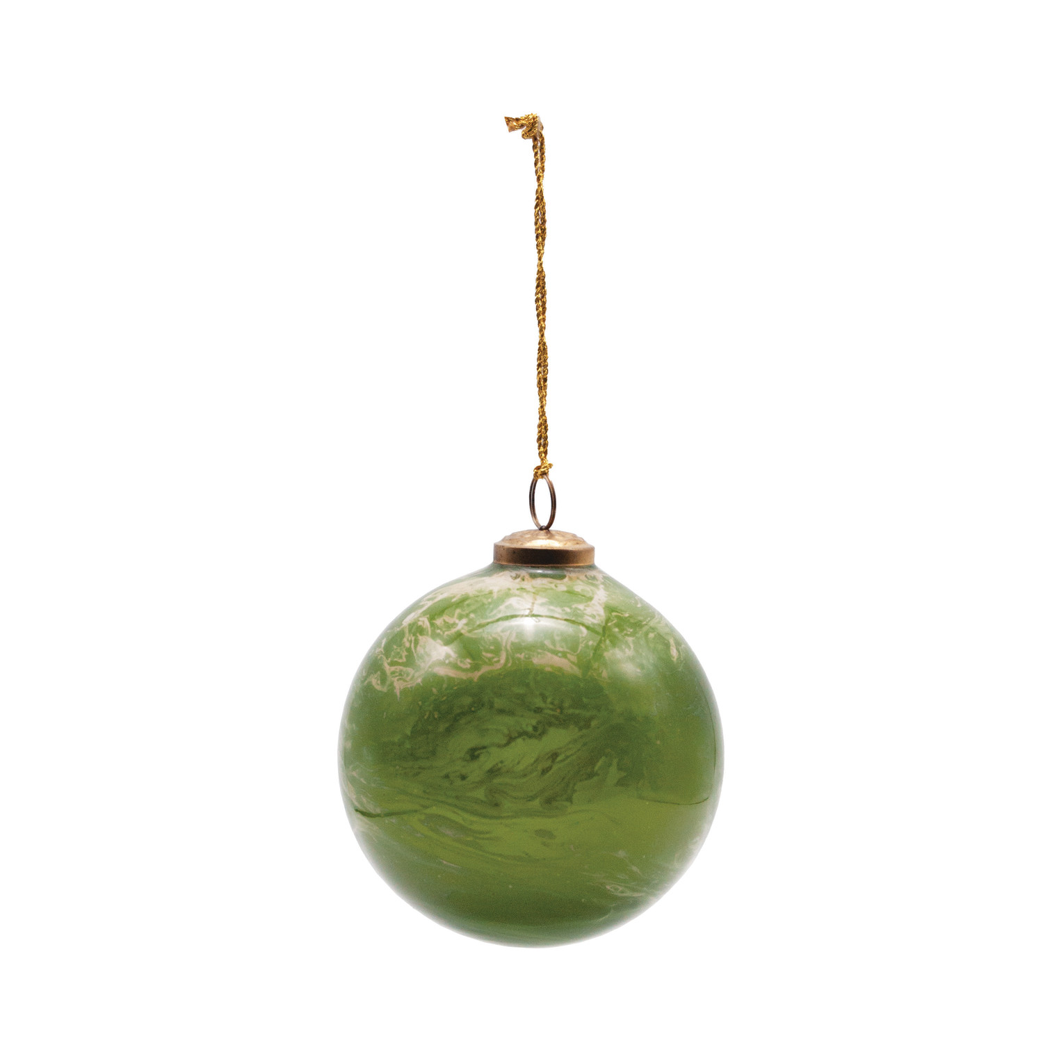 Catalog Name: 4" Round Glass Ball Ornament, Marbled Green & Gold Finish