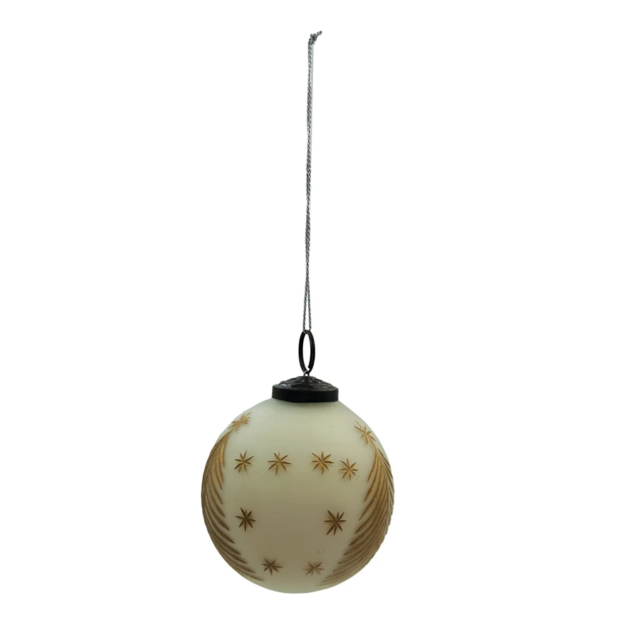 Catalog Name: 3" Round Hand-Painted Glass Ball Ornament w/ Etched Trees & Stars, Matte Ivory Color & Gold Finish