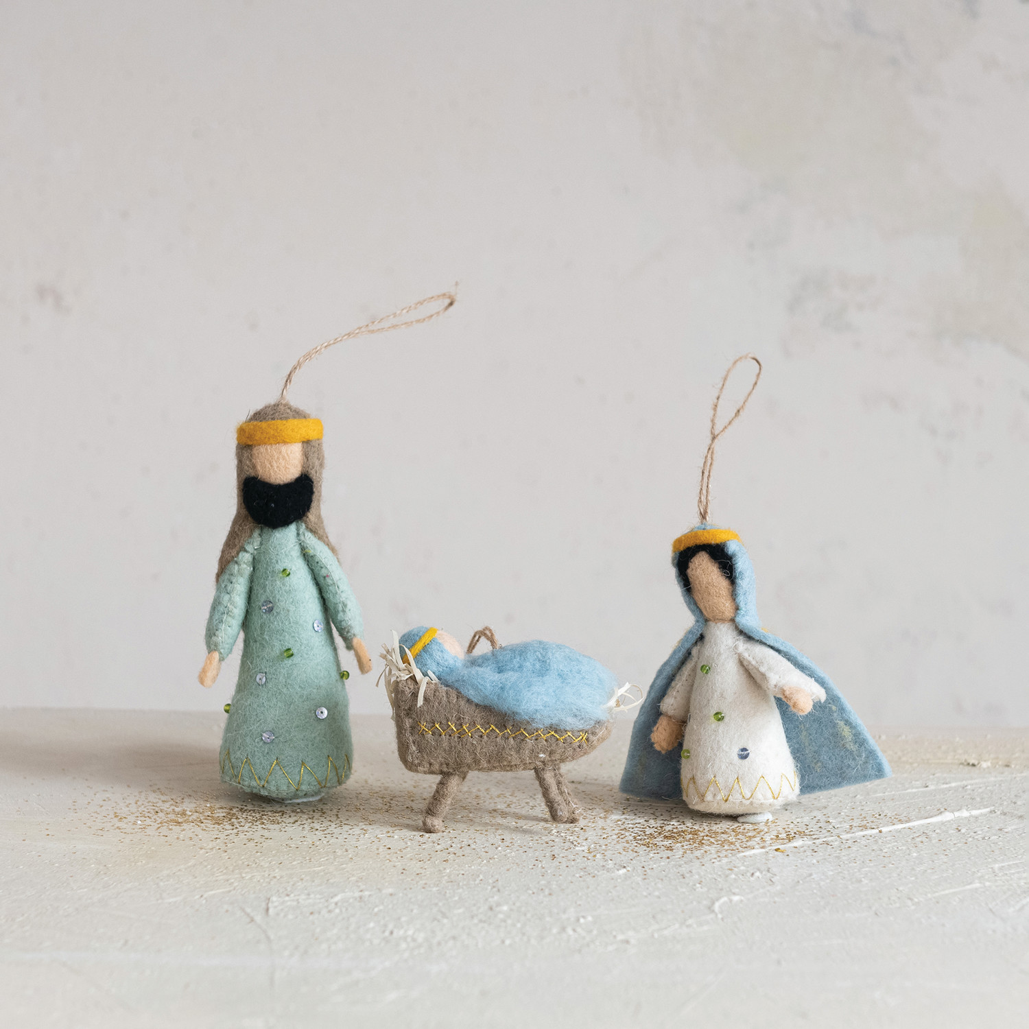 Catalog Name: 4"H - 6-1/2"H Handmade Wool Felt Holy Family Ornament w/ Glass Beads, Sequins & Metallic Thread Embroidery, Multi Color, 3 Styles ©