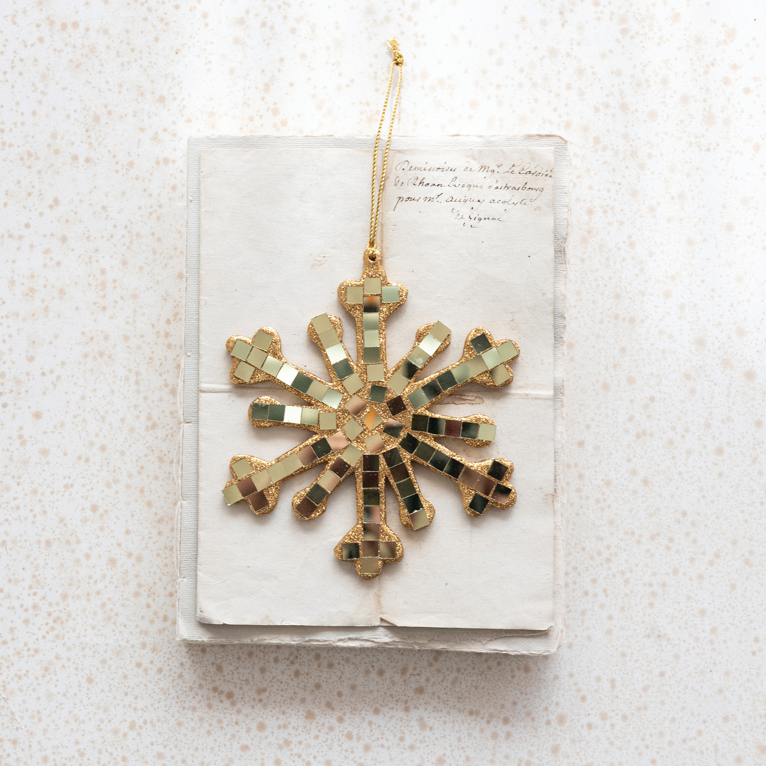 Catalog Name: 6-1/4"H Handmade Glass Mosaic Snowflake Ornament w/ Glitter Edge, Gold Finish