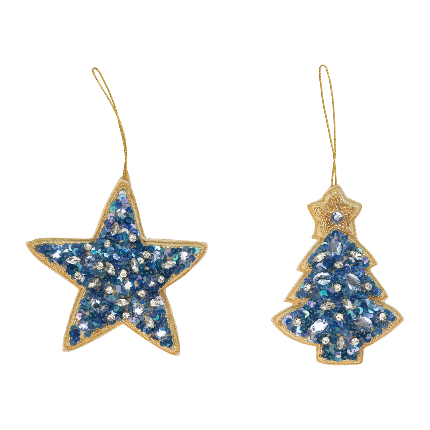 Catalog Name: 4-1/2"H Handmade Beaded Velvet Fabric Star/Tree Ornament w/ Sequins, Blue & Gold Color, 2 Styles
