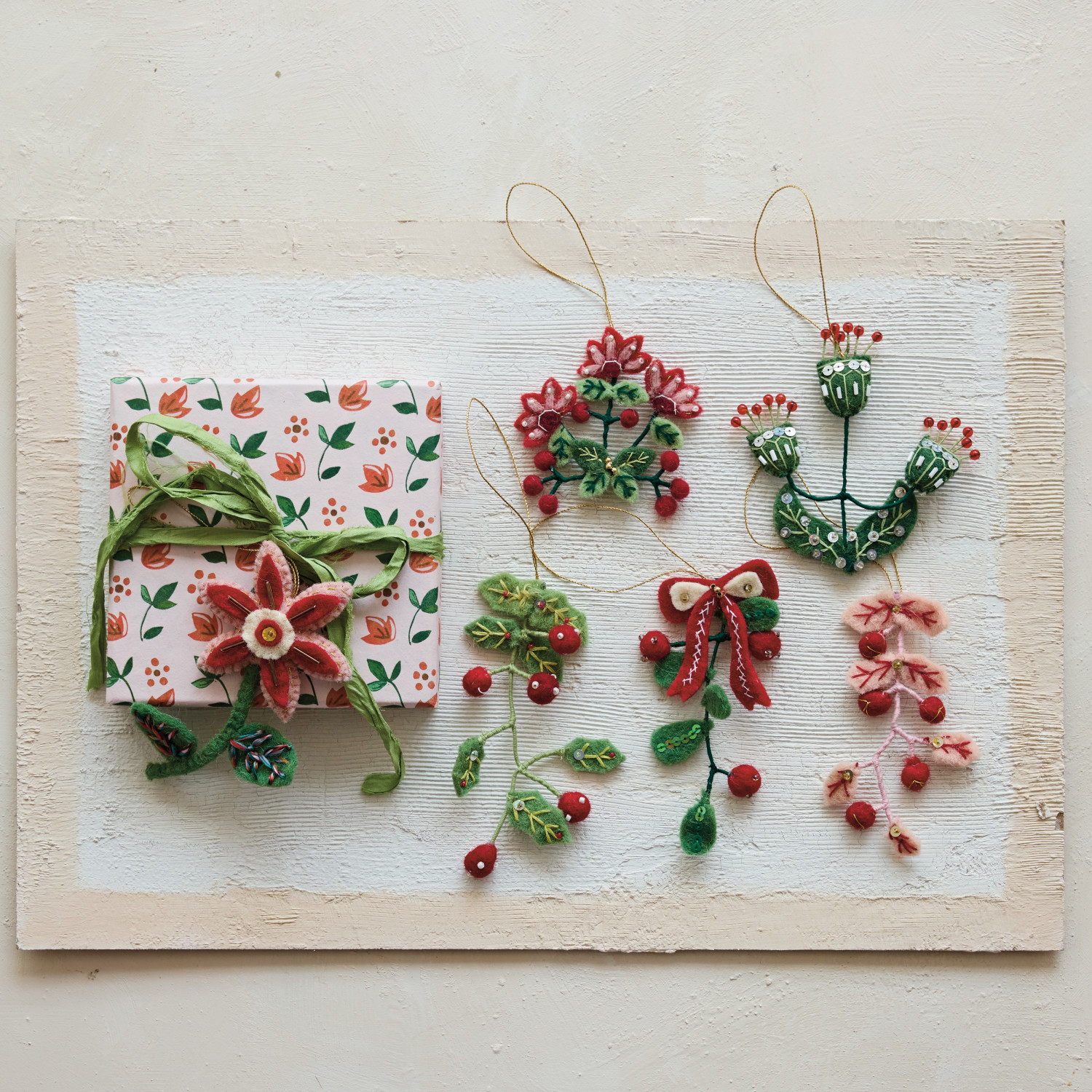 Handmade Wired Wool Felt Holiday Botanical Ornament, 6 Styles ©